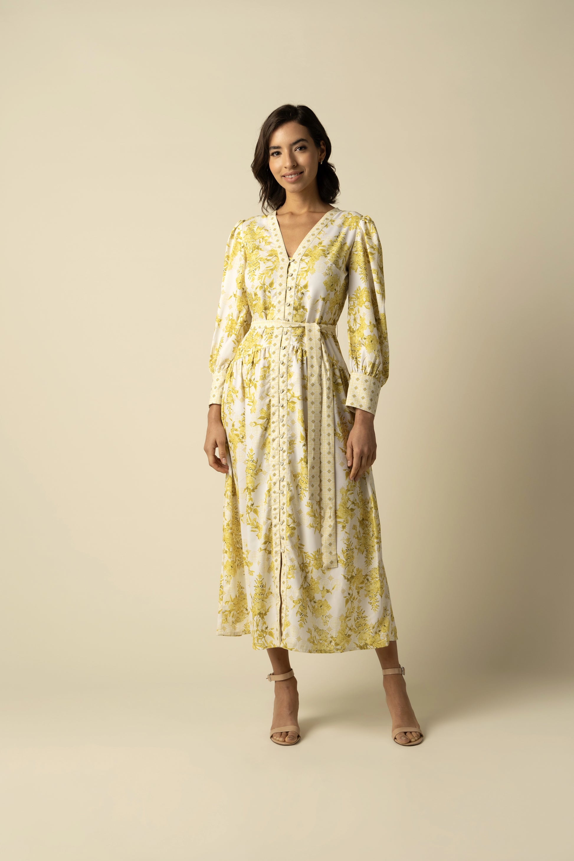 Illuminate your style with the Aaliyah Yellow Dress, a radiant addition to your spring collection. This dress features a fabulous yellow floral print, creating a sunny disposition for any event. With a flattering V-neckline, cinched waist, and long sleeves, it is comfortable yet chic. Ideal for weekend outings or casual gatherings, this dress is a cheerful statement piece.