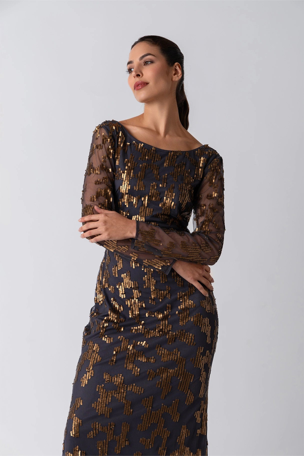 Discover the Alexa Gown, where timeless grace meets modern glamour. This long-sleeved gown is adorned with bold golden patterns on a deep, charcoal canvas. Crafted to flatter with a sleek silhouette and a delicate train, the Alexa is your perfect plus-one to a high-profile event or an elegant evening affair. It's the dress that defines sophistication. Make your statement with the Alexa Gown.