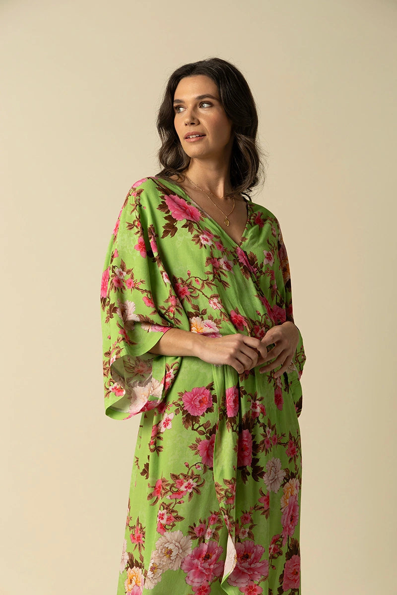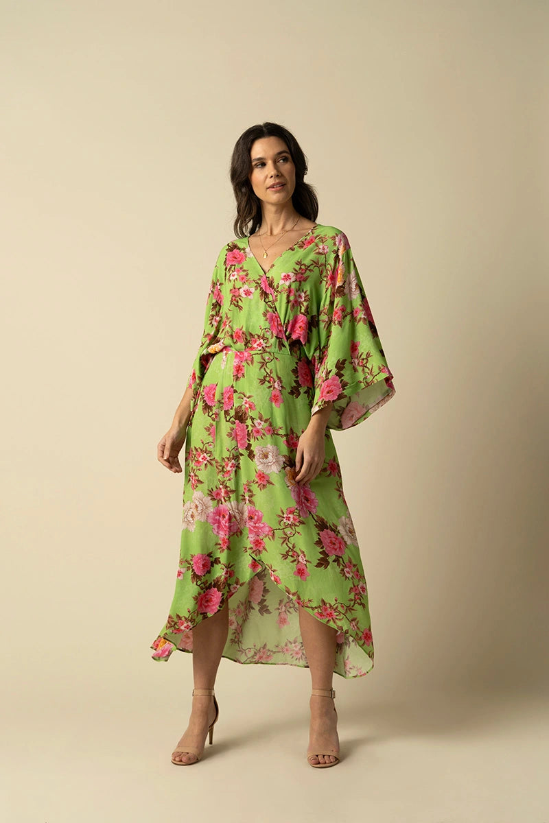 Welcome a touch of green splendor with the Alice Dress, a lush staple for your spring-summer rotation. Adorned with bold pink florals on a bright green background, it features a flattering V-neckline and breezy, wide sleeves. The midi-length hem and wrap tie cinch the waist for an effortlessly feminine silhouette. Perfect for sunny day soirees or casual brunches, the Alice Dress is there.