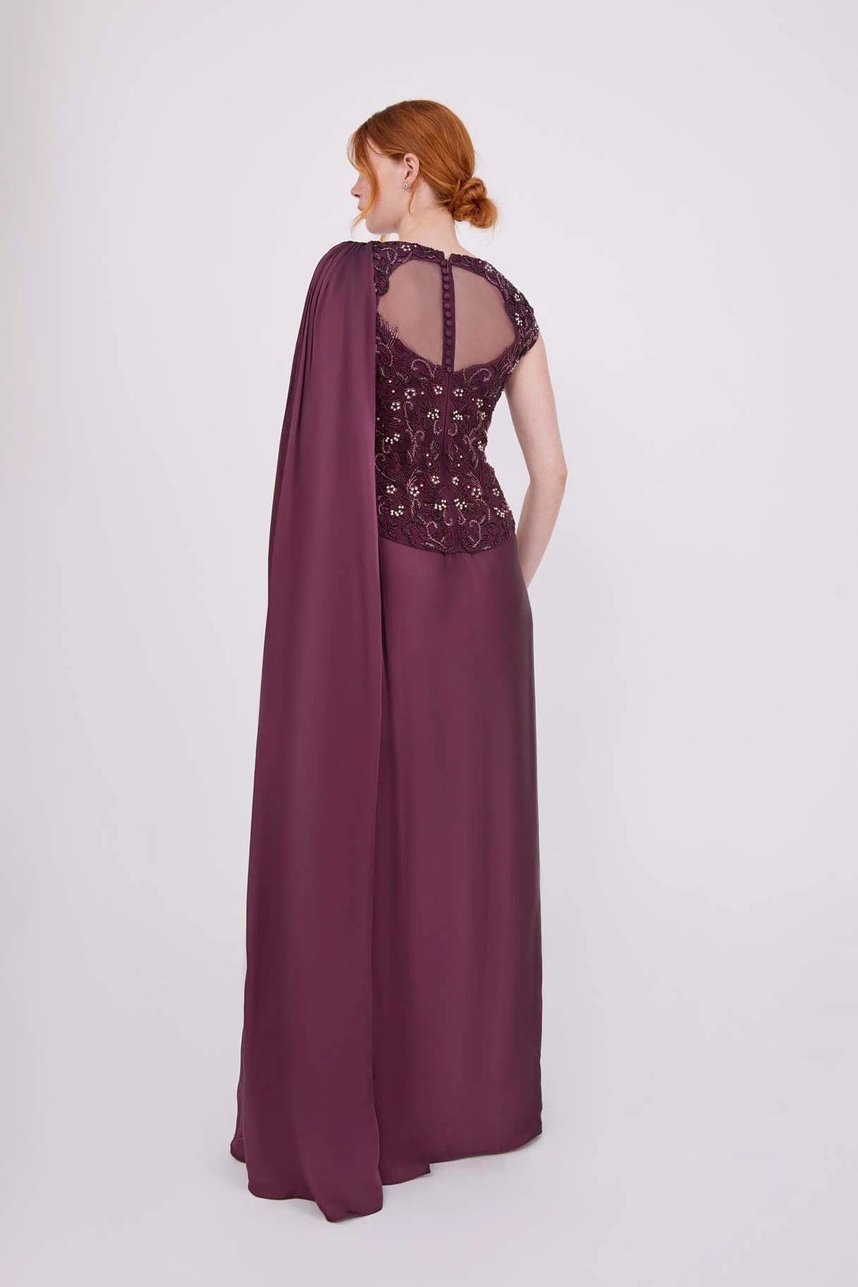Elegant maroon draped outfit featuring intricate floral embroidery on the bodice, perfect for formal events or weddings. This sleeveless design offers a modern twist on traditional wear with flowing fabric and sophisticated detailing. Ideal for women seeking a blend of contemporary style and timeless grace.