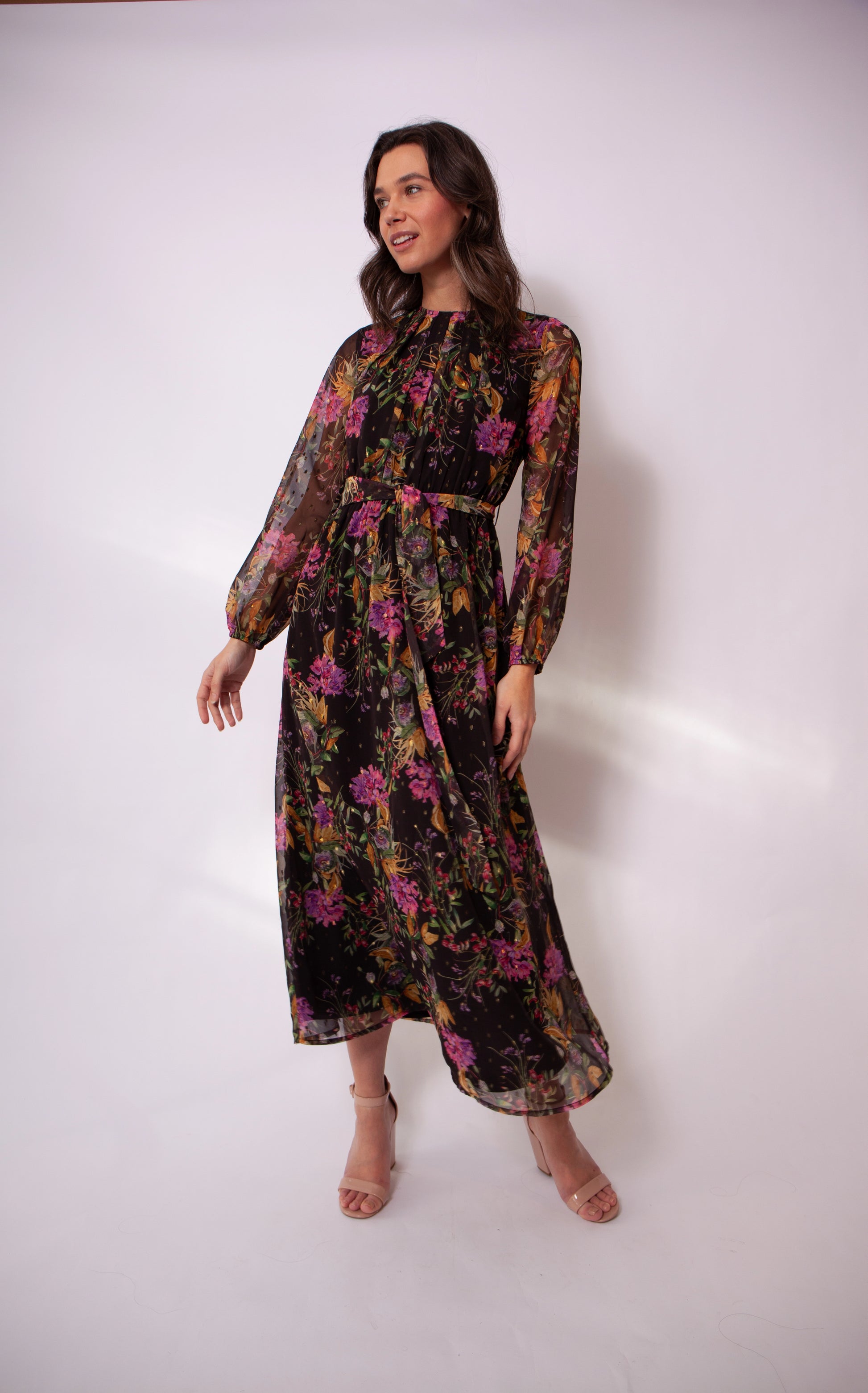 The Annalise dress is a floral blend of elegance and charm. Crafted from sheer, lightweight chiffon lurex fabric, this dress features a beautiful floral print in pink and yellow accents on a black backdrop. The high neckline with a delicate tie, long sheer sleeves, and cinched waist creates a flattering silhouette that flows into a voluminous midi-length dress. Perfect for work events or Sunday brunch, pair the Annalise dress with some strappy sandals and a clutch to complete the look!
