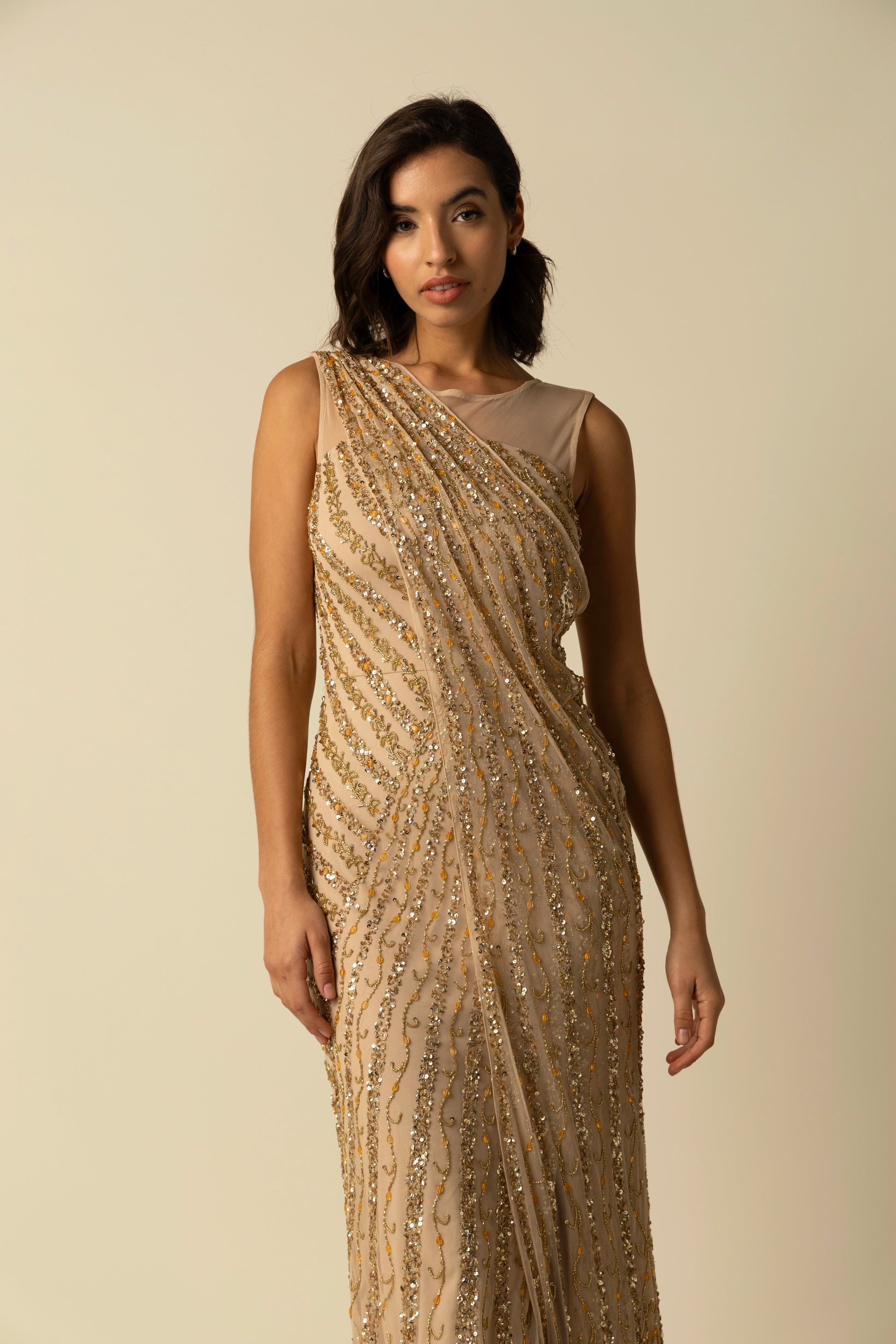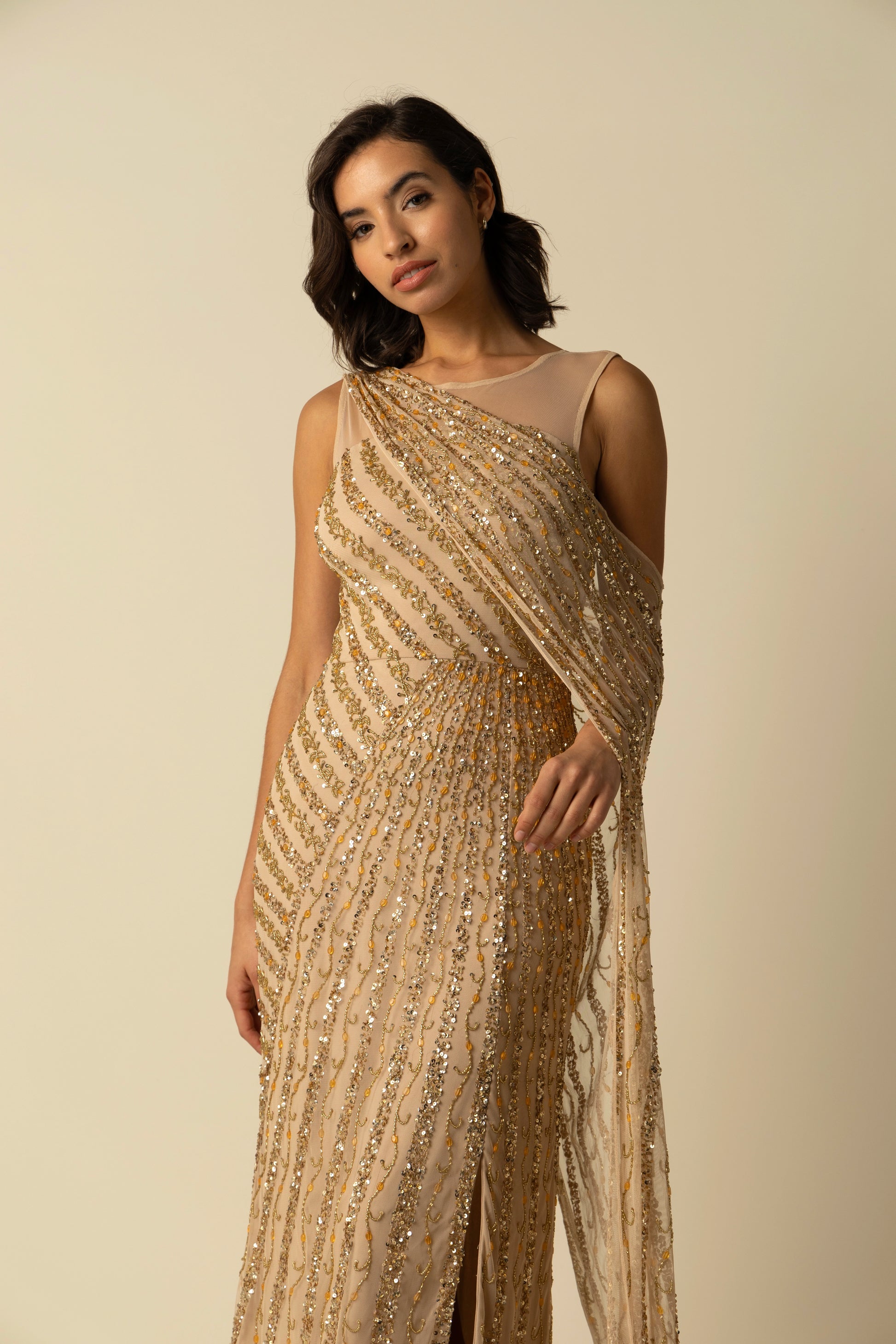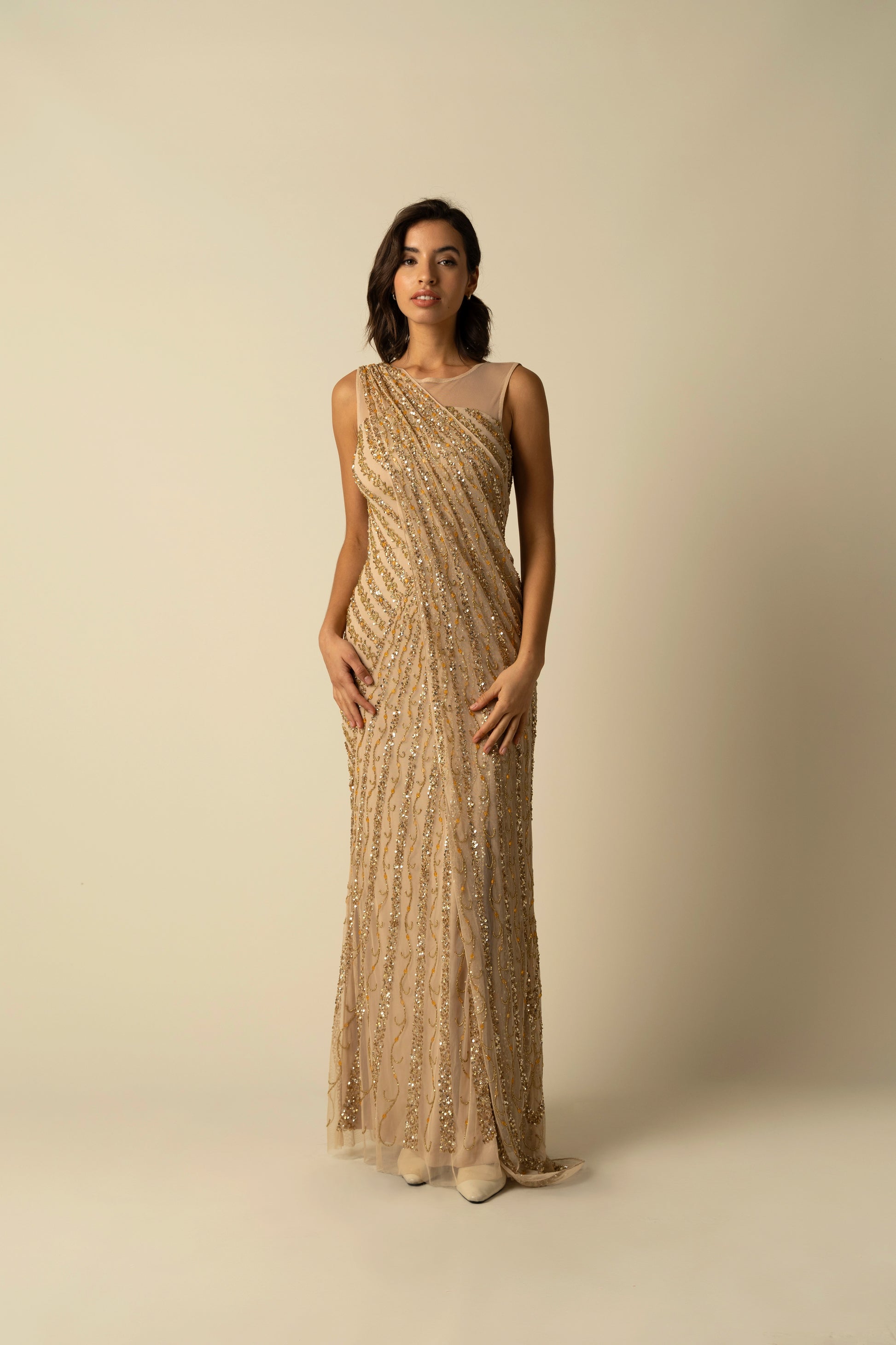 The Arya Gold Gown is a showstopper, draped in champagne elegance with a sweep of golden sequins. This draped shoulder gown offers a modern silhouette with timeless glamour, perfect for exclusive evenings and black-tie events. Its sleek design and sparkling detail work together to create a stunning profile that shines from every angle. For those seeking a blend of luxury and style, the Annabella Gown is the quintessential choice.