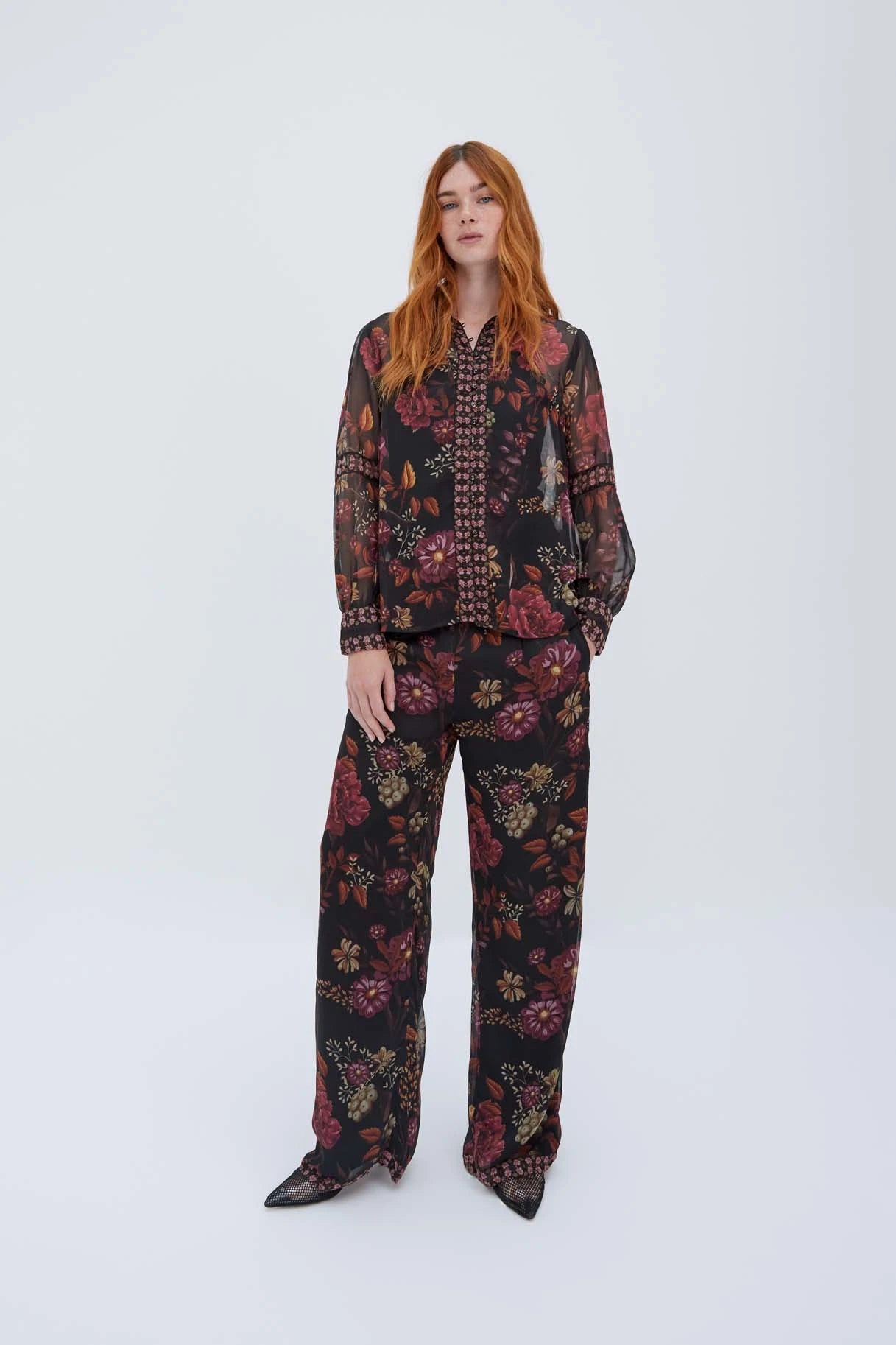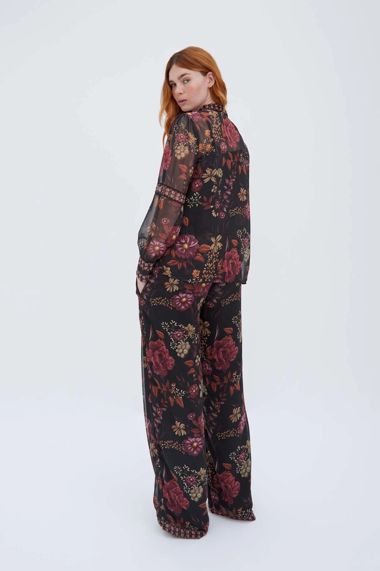 A vibrant floral-print chiffon shirt in black, designed with a button-down front, high neckline, and puffed sleeves. Comes with a matching camisole for easy wear. Pair with the Aspen trousers for a chic co-ord look.
