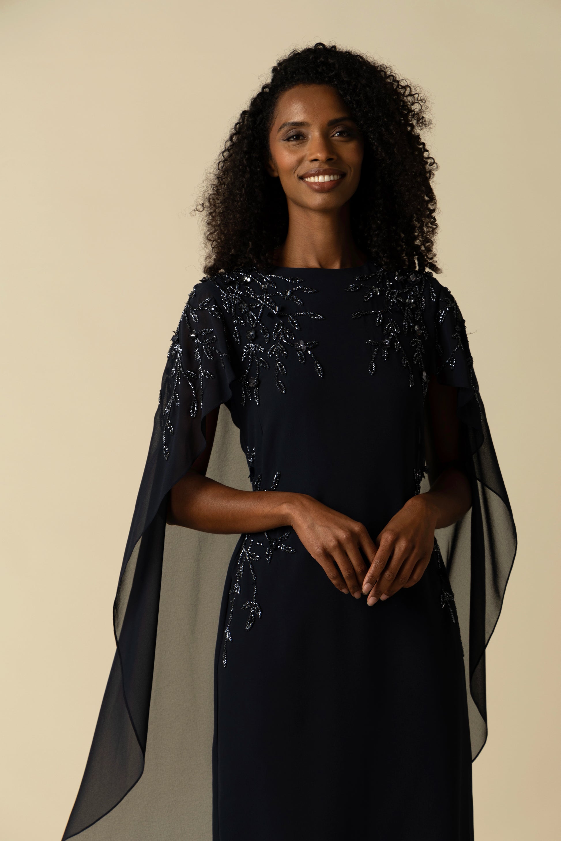 Step into the spotlight with the Bella Dress, a masterpiece of midnight elegance. This chic knee-length navy number dazzles with its sequin-embellished cape overlay, offering a sophisticated play of light and shadow. Perfect for high-profile events, its sleek silhouette and fluid lines promise to flatter and enchant. With the Bella Dress, prepare to be the embodiment of grace at every soirée.