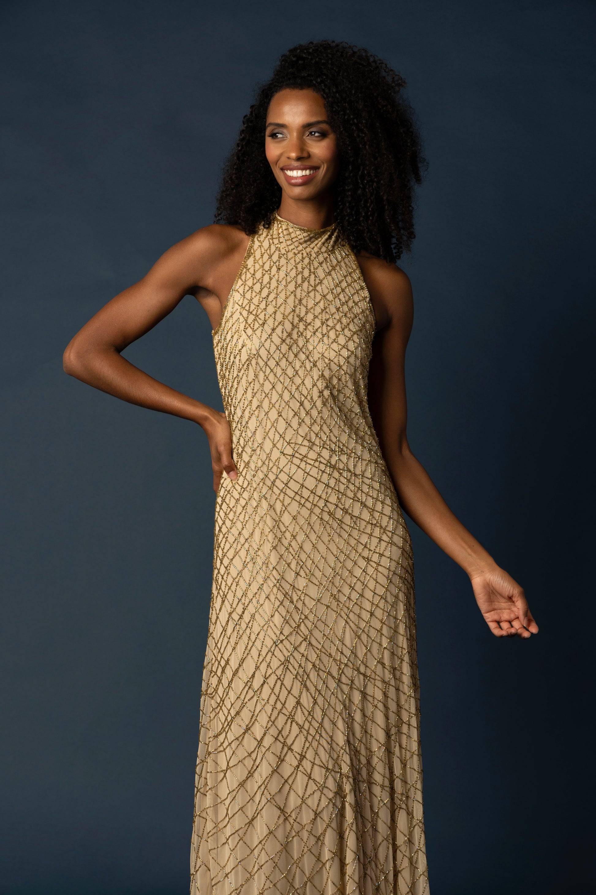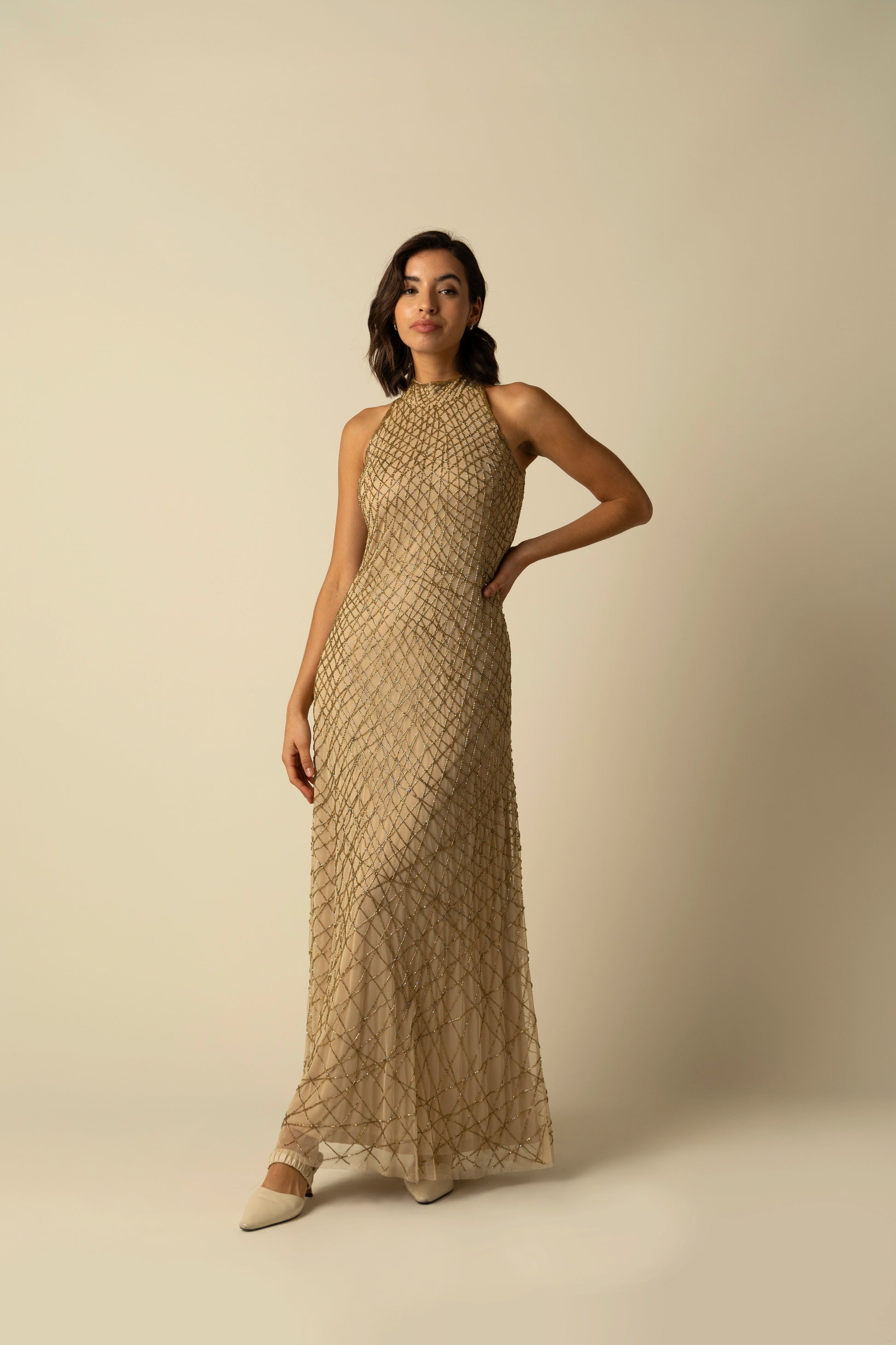 The Belle Gown is a golden vision, perfect for those who love to shine. Its high halter neck and sleek silhouette are covered in a glamorous geometric sequin pattern, offering a modern take on classic elegance. This gown is designed to make a statement at galas, weddings, or any event where making an impression is key. Step into the Belle Gown and embody the luxurious sophistication it brings.
