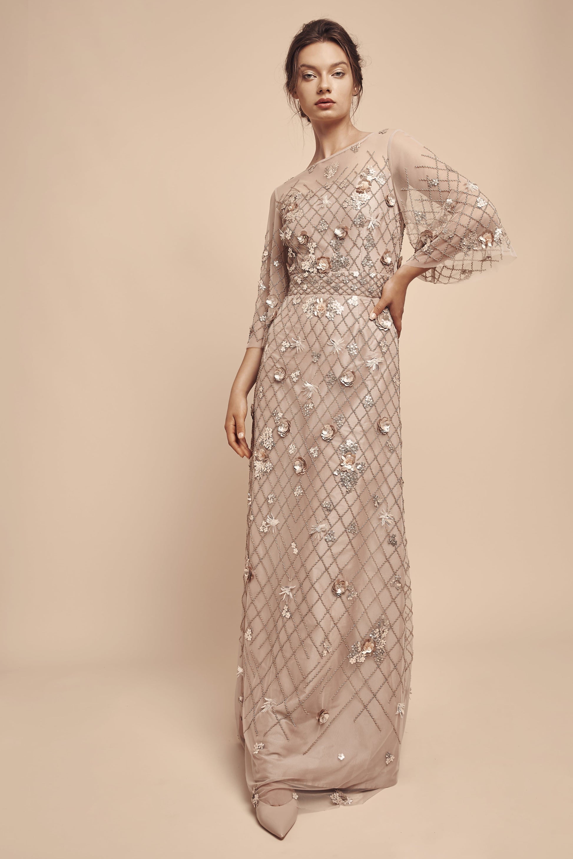 The Joan Gown is an exquisite blend of charm and grace. Adorned with delicate floral sequin appliques on a sheer overlay, it exudes romantic elegance. This gown's soft taupe hue and sheer sleeves create a look of timeless sophistication.