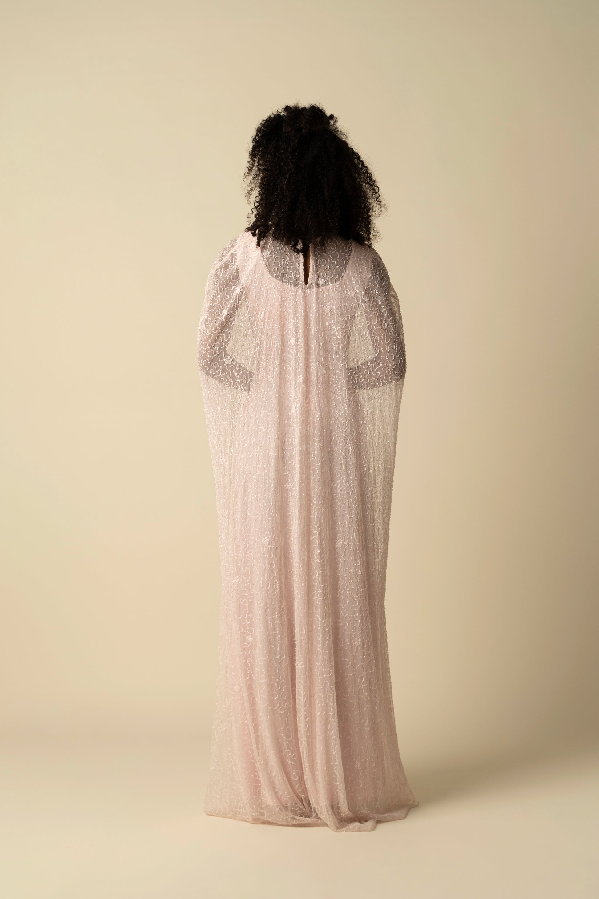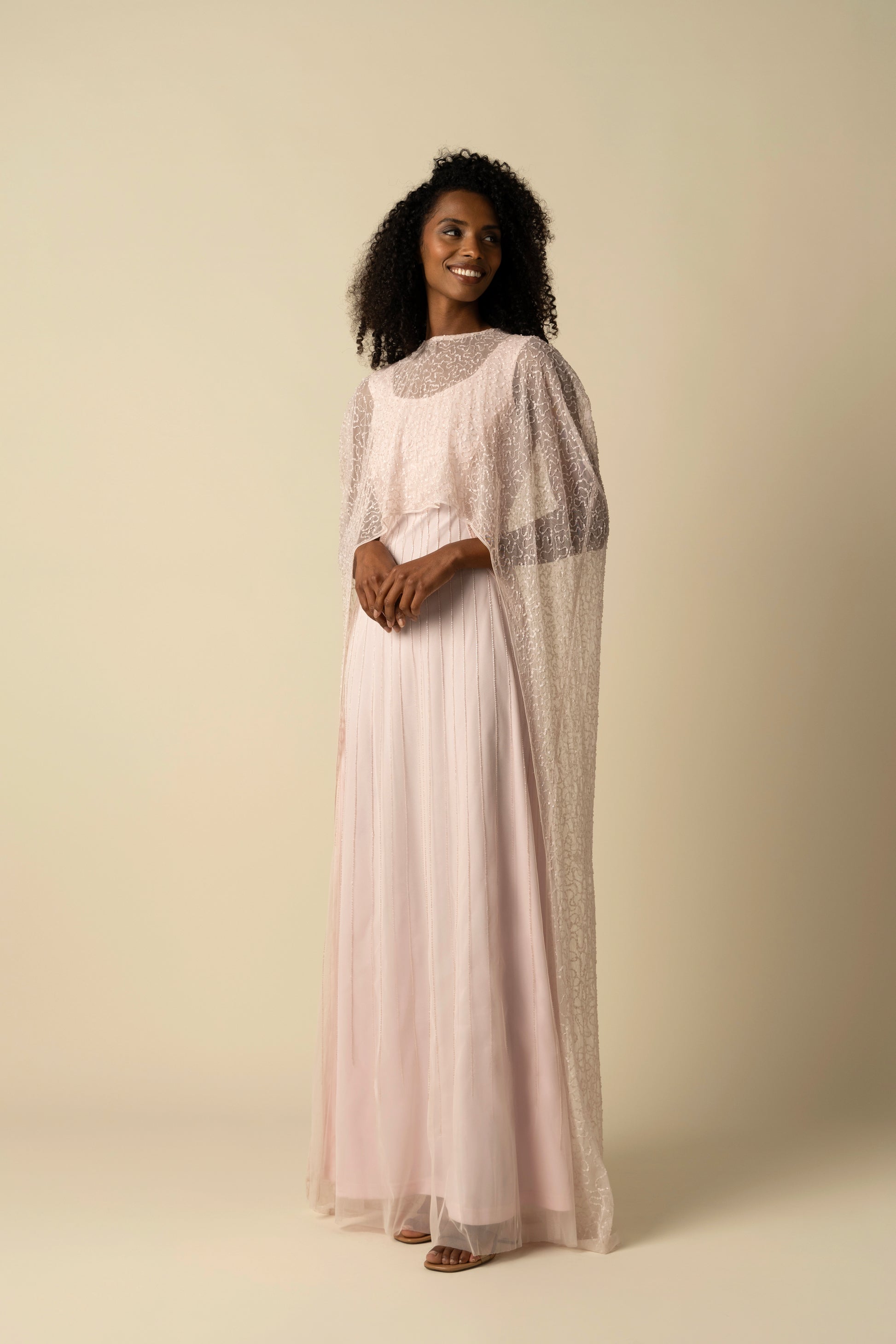Discover the allure of the Melony Blush Cape Gown, a dreamy ensemble that blends ethereal grace with a touch of vintage charm. This gown features a flowing cape overlay that cascades over a beaded dress. Its subtle blush tone exudes romance, making it perfect for bridesmaids, springtime soirees, or elegant receptions. Secure this breathtaking gown and enchant everyone with your timeless elegance. The Melony Blush is an unforgettable look.