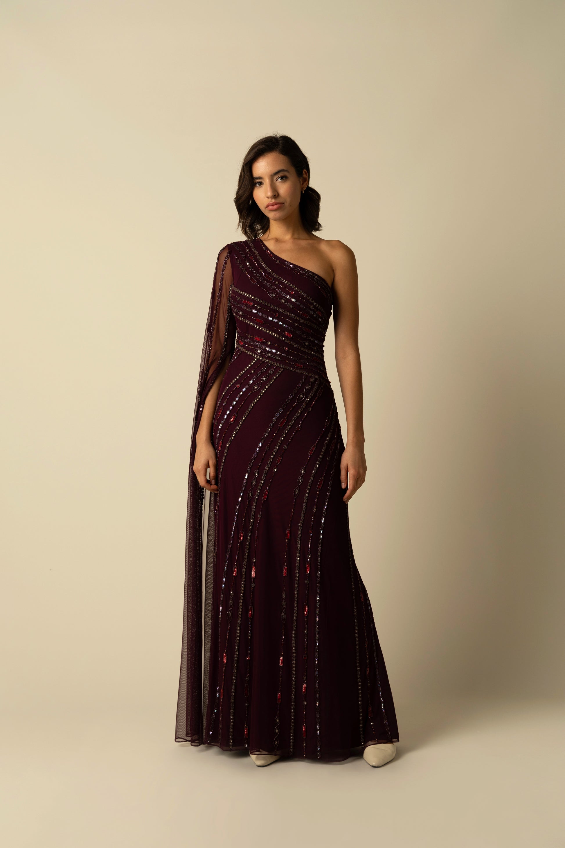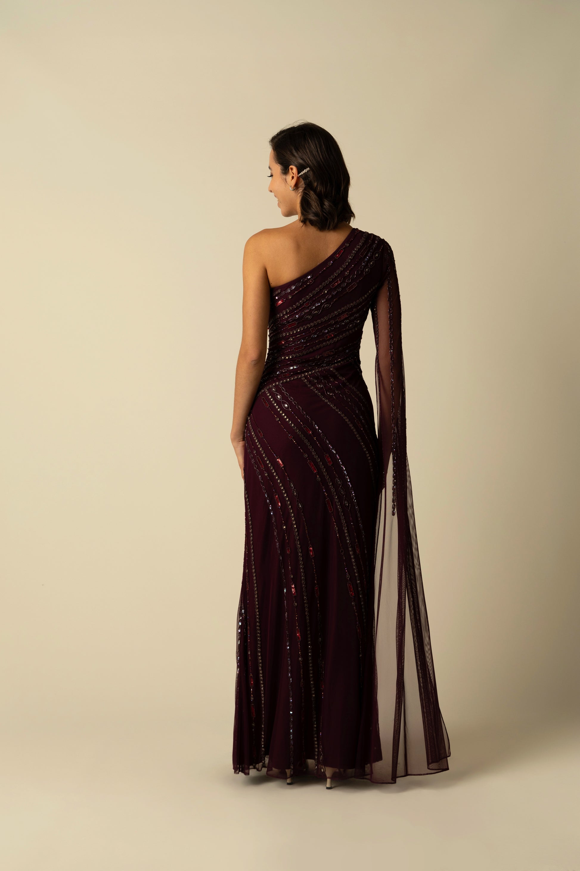 Indulge in the opulence of the Kalina Burgundy Gown, a single-shoulder sensation adorned with sparkling sequin stripes. This gown's asymmetrical neckline and sash add a touch of mystery, while its figure-hugging silhouette showcases a timeless elegance. Ideal for evening galas or weddings, the Kalina's rich burgundy shade makes an exquisite piece to your wardrobe for an instant dose of glamour.