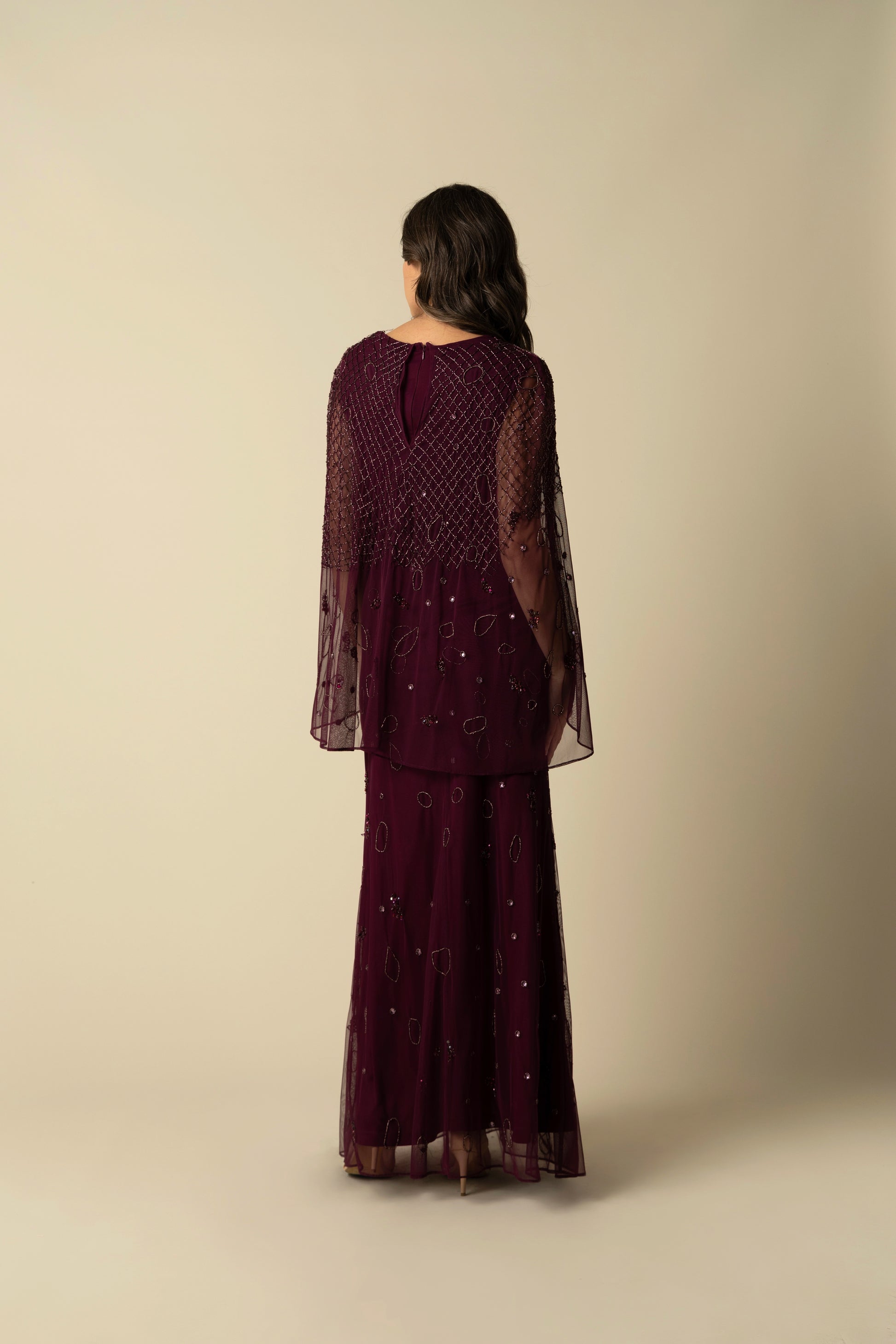 Elevate your evening look with the Burgundy Selena Gown, a captivating ensemble that boasts exquisite beadwork in circular motifs. This gown features a V-neckline and a floating, beaded cape sleeve, offering a modern twist on classic elegance. The deep burgundy hue makes it the epitome of sophistication, perfect for formal occasions. Optimized for making a memorable entrance. Embody timeless elegance at your next event.