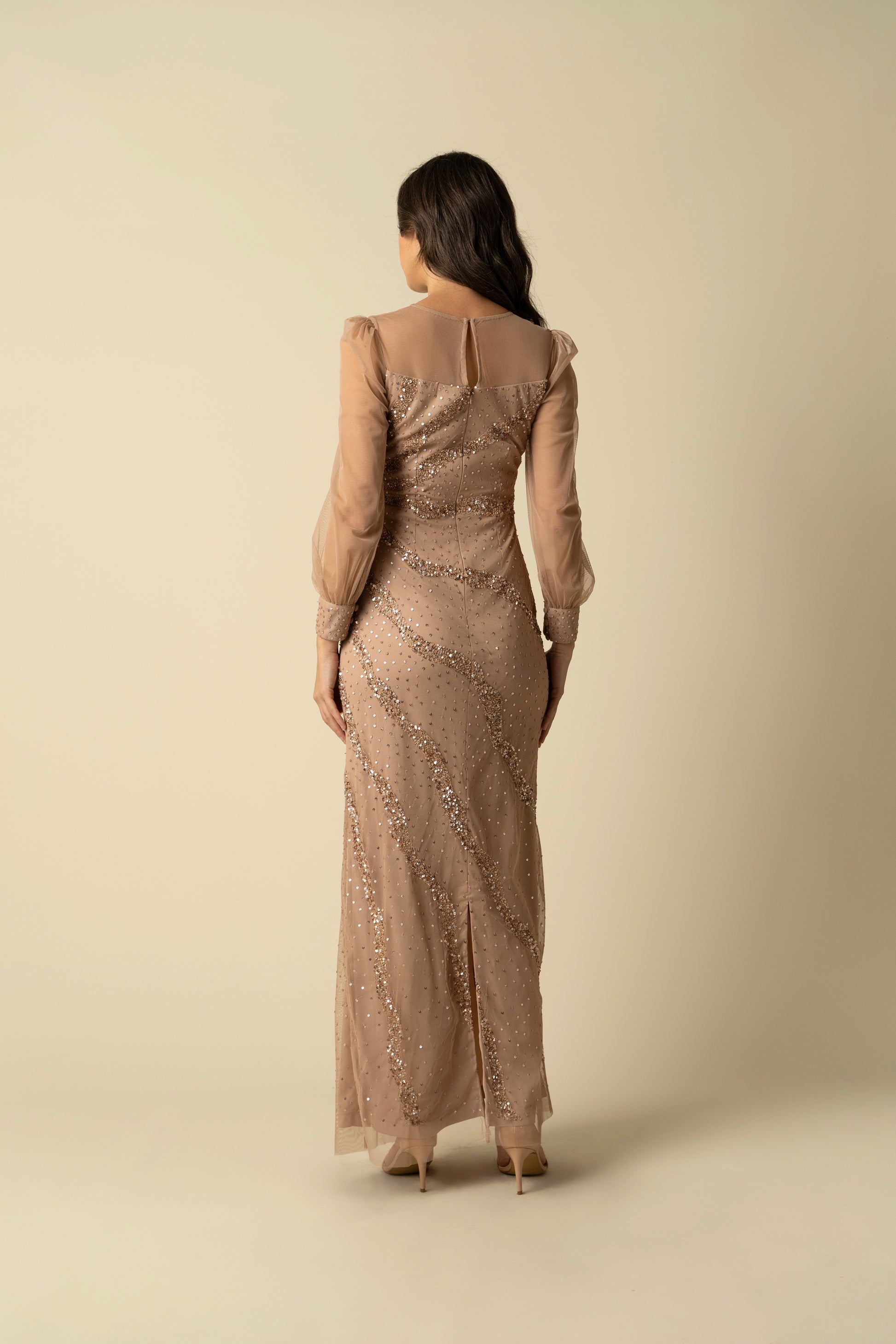 Introducing the Capri Gown, a vision of shimmering elegance. Draped in delicate blush fabric, this dress features a wave of sequin embellishments that sparkle with every step. The long, sheer sleeves and classic round neckline create a silhouette that's both demure and dazzling. Tailored to make a sophisticated statement at formal events, the Capri Gown is the ideal choice for those searching to capture the essence of refined glamour.