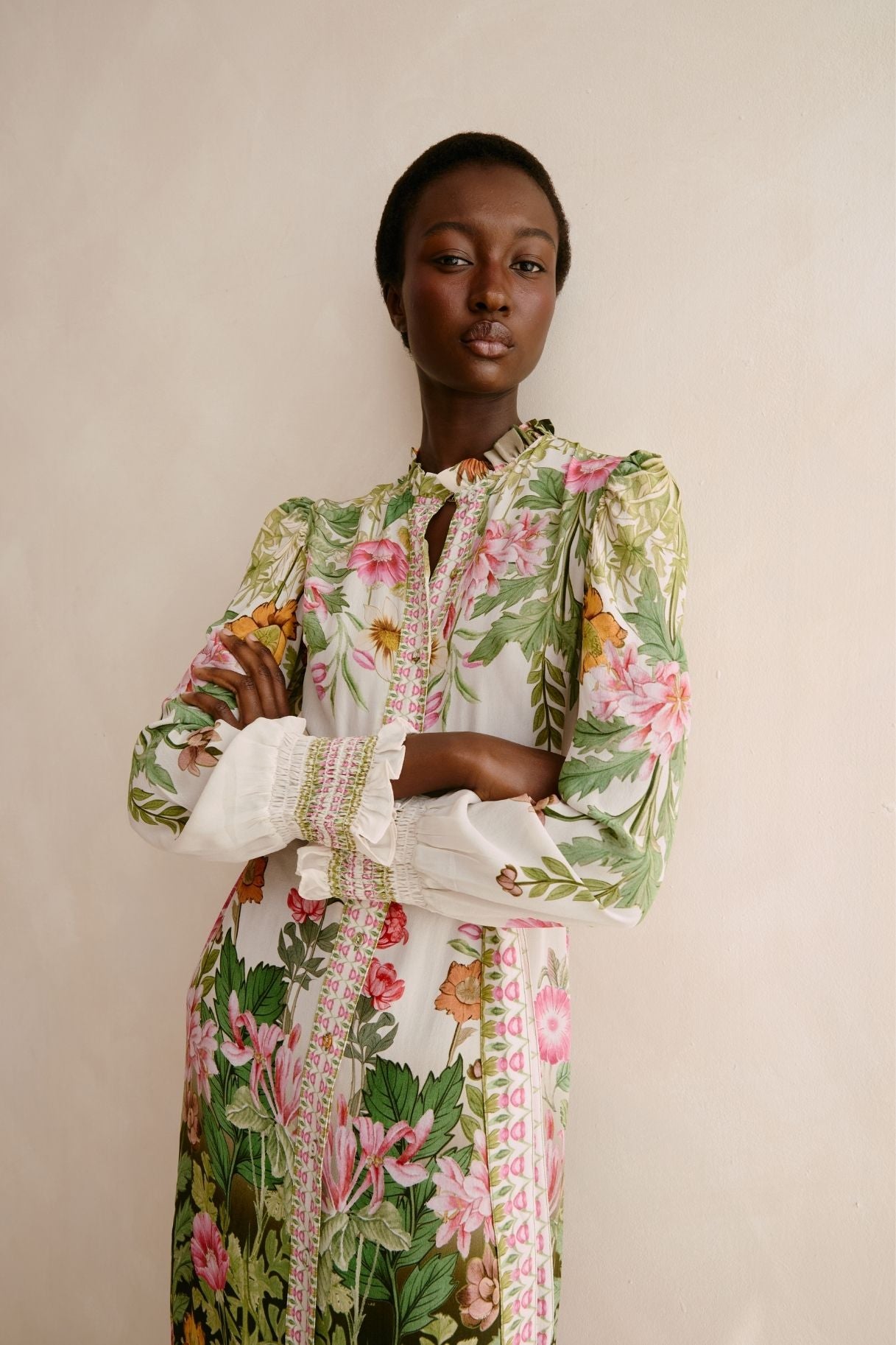 A printed midi dress crafted in lightweight Moroccan crepe with a flattering silhouette and elegant movement through the skirt. Finished in a classic cream tone, this style offers a refined option for daytime events, holidays, and occasion wear.