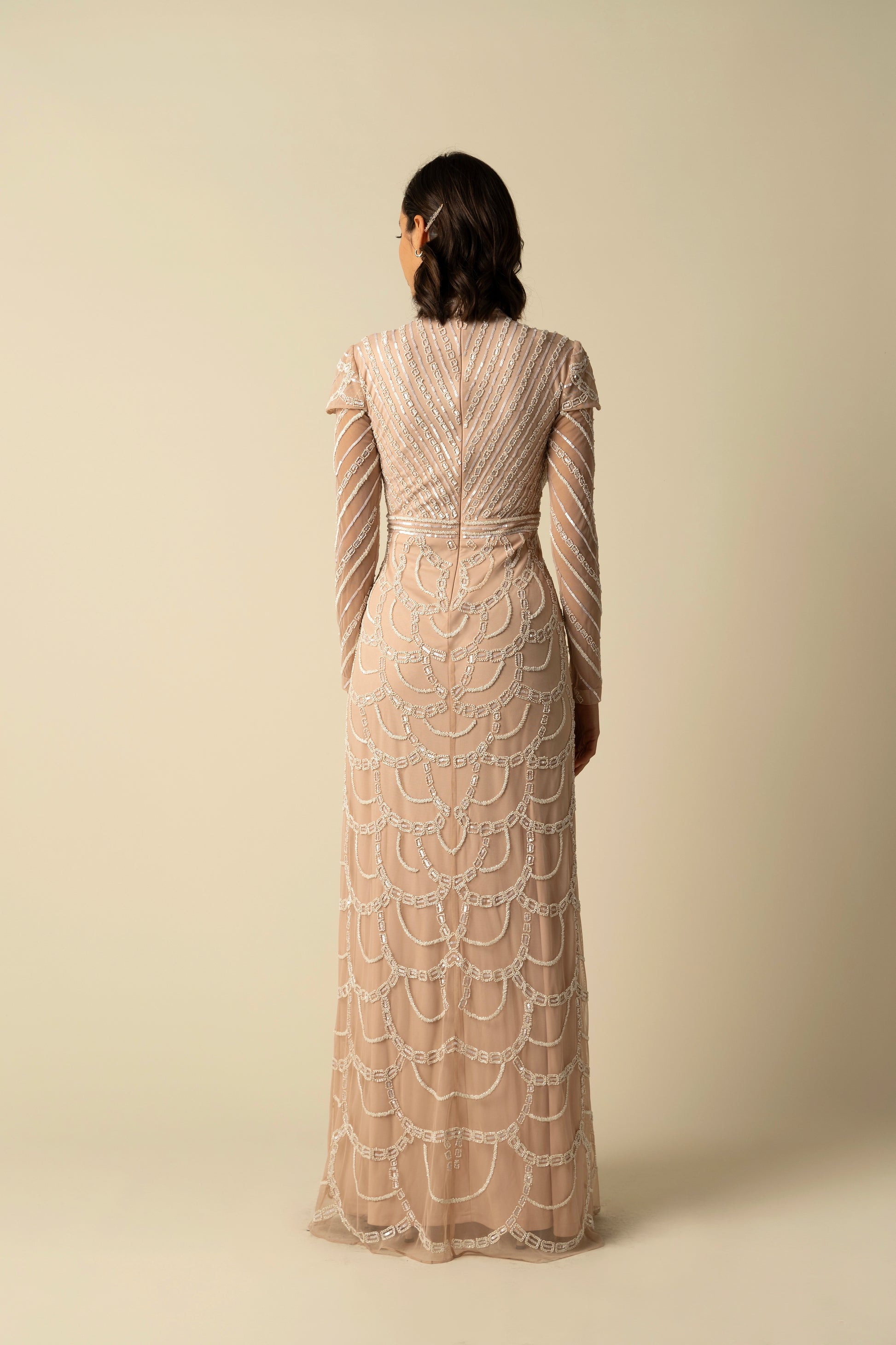 The Casey Gown exudes romance with its soft blush hue and intricate scalloped beadwork. With a V-neckline and slit, this gown combines modernity with classic charm. The long sleeves add a touch of sophistication, perfect for bridesmaids or evening events. For the refined dresser, the Casey Gown is a stunning selection. Embrace timeless beauty with this enchanting gown.