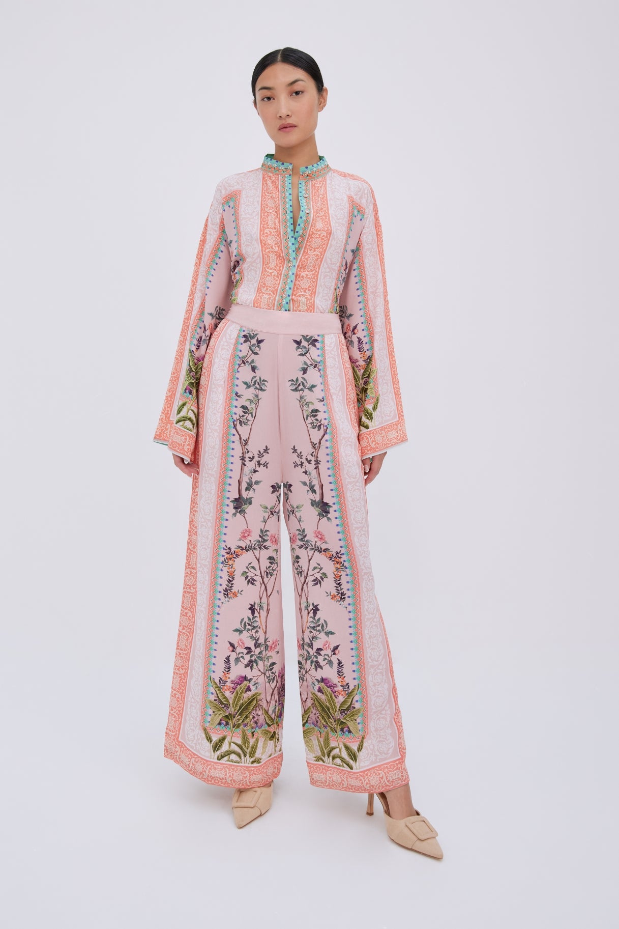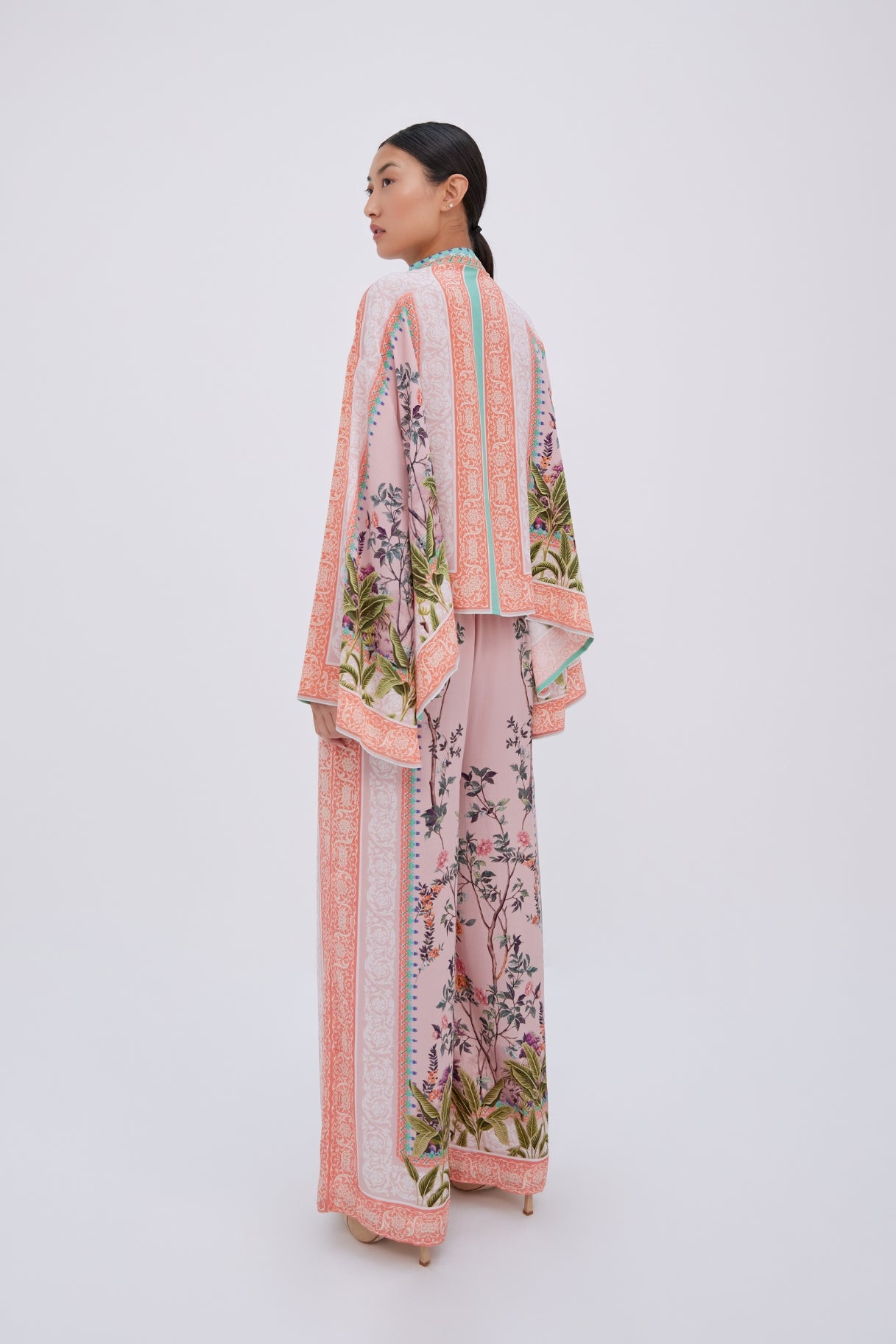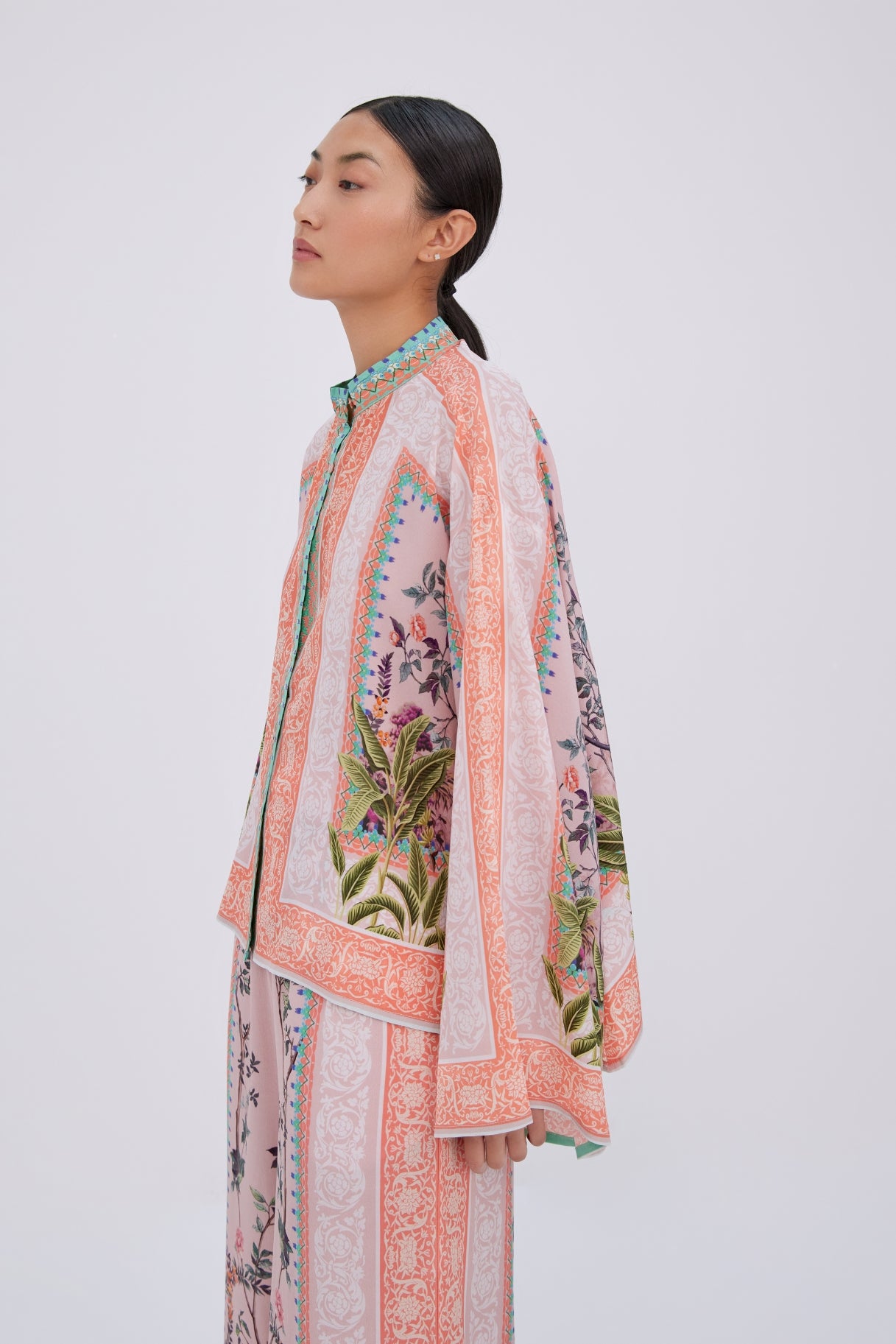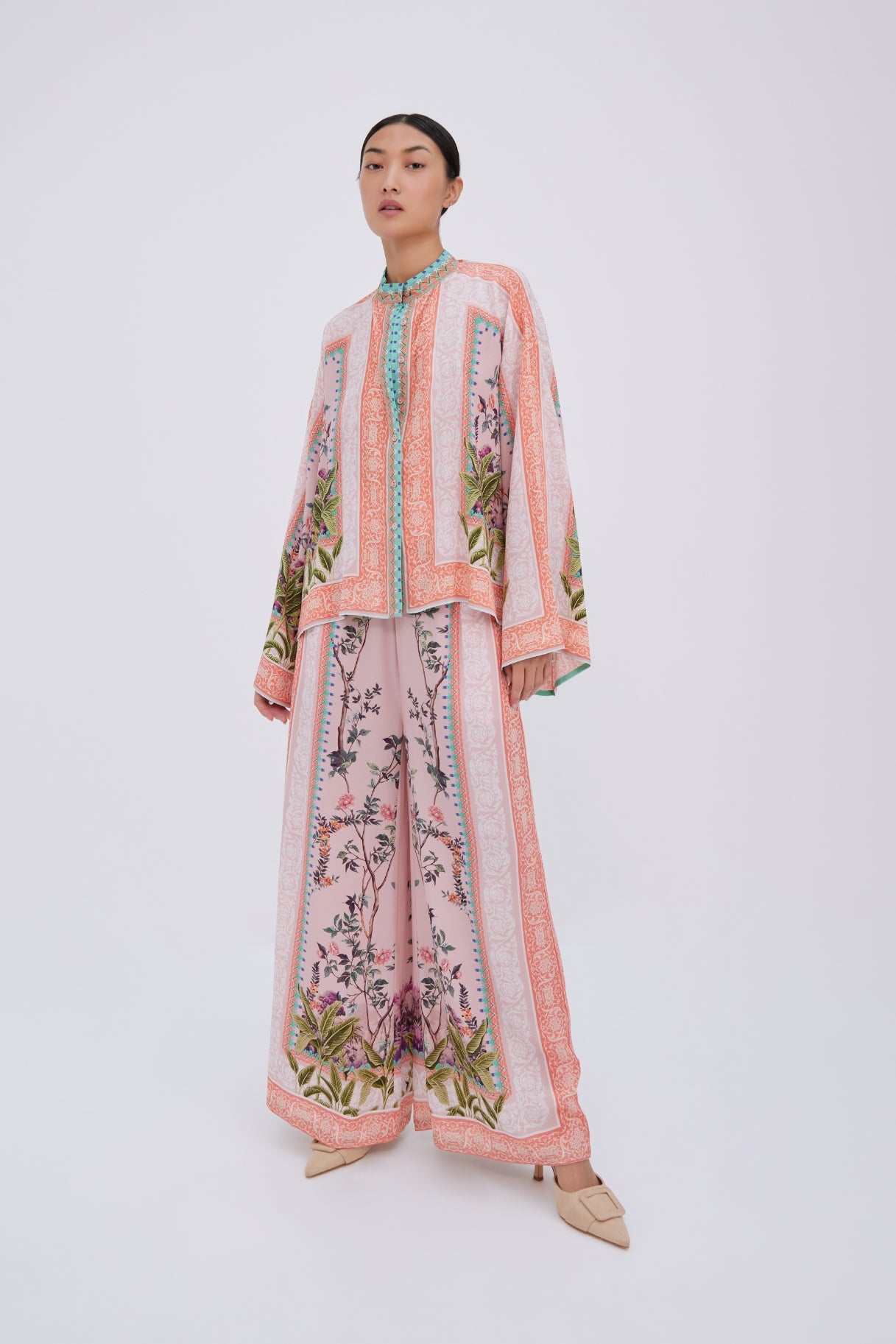 Crafted from luxurious silk, this relaxed-fit shirt features hand-drawn floral and border prints in soft pink and coral tones. The fluid silhouette and delicate detailing make it a standout piece—perfect for relaxed occasions or dressed-up styling.