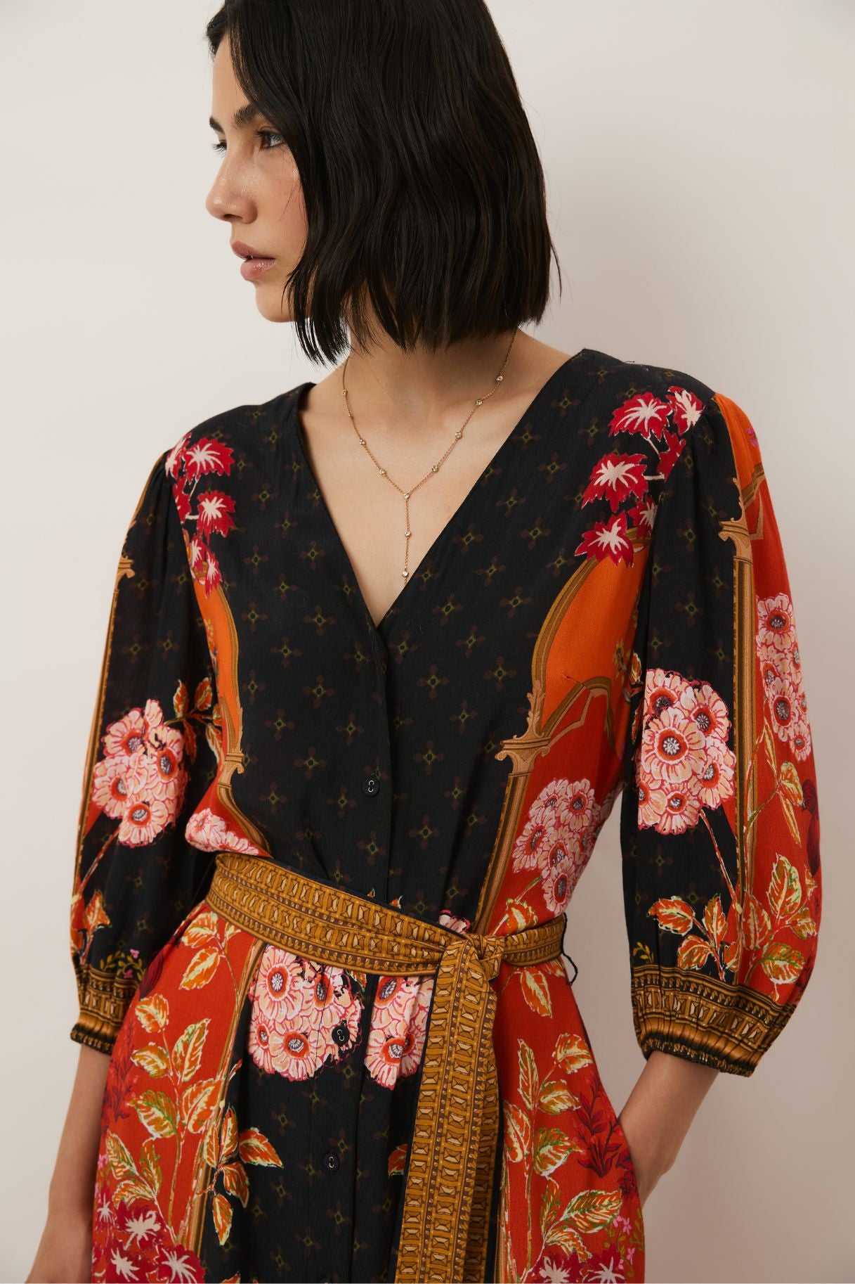This is a vibrant, bohemian-style midi dress featuring a deep V-neckline and long puffed sleeves. The black base is adorned with intricate golden motifs and bold floral prints in rich shades of red, pink, and orange. A textured mustard-gold sash cinches the waist, adding definition and elegance. The skirt showcases large floral arrangements framed by ornate architectural patterns, finished with a decorative border at the hem. Made from a lightweight, flowy fabric, the dress pairs beautifully with gold square-toe mules for a refined yet artistic look.