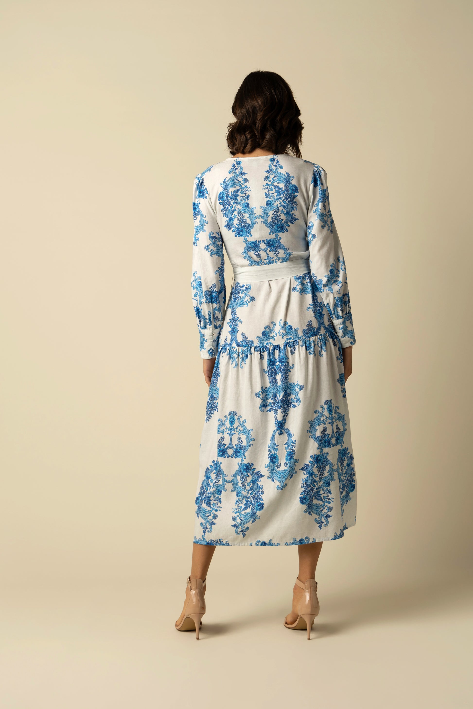 The Kleo Dress, a delightful fusion of classic charm and contemporary design. This elegant midi dress features a crisp white backdrop adorned with a striking blue floral print. Designed with a V-neckline, button details, and a waist-cinching tie, the Kleo Dress exudes a sense of refined sophistication. Perfect for a brunch date or a stroll through the park, it’s a versatile addition to any stylish wardrobe.