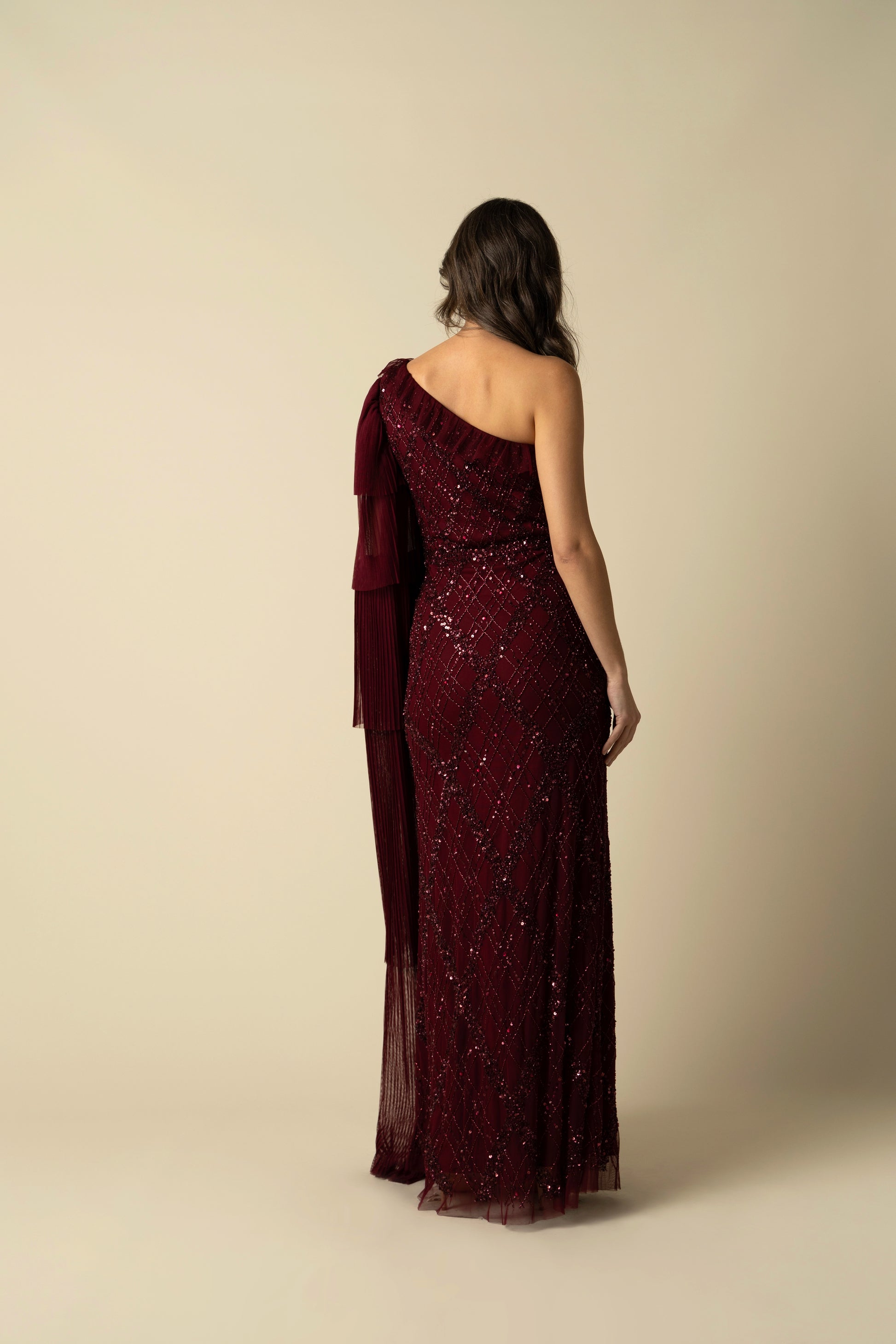 Embrace the evening in the Leilani Gown, a masterpiece of burgundy brilliance. Adorned with intricate sequin work, this one-shoulder gown drapes beautifully, finished with a sheer, pleated sleeve that adds movement and depth. Perfect for weddings, red carpet events, or any occasion where elegance is a must. The Leilani Gown is a show-stopping piece that promises a lasting impression.