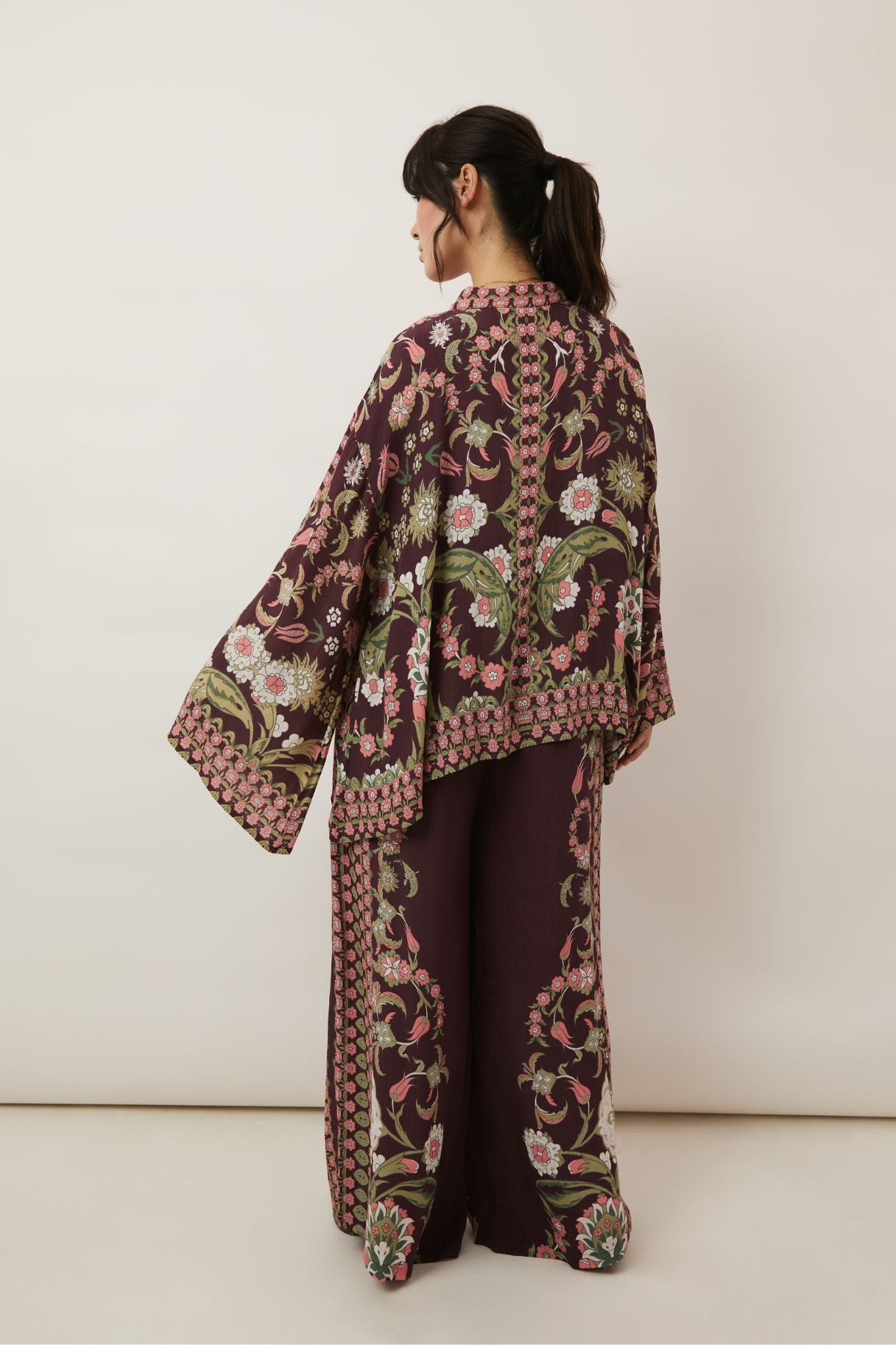 This floral shirt features a flowing, oversized silhouette with full-length sleeves and a high round neckline. Decorated with intricate floral motifs in soft pink, white, and green tones, it has front panel detailing framed with traditional-style border prints. The lightweight fabric offers comfort and elegance, making it ideal for festive occasions or resort wear. Pair it with the matching wide-leg trousers for a coordinated, statement look.