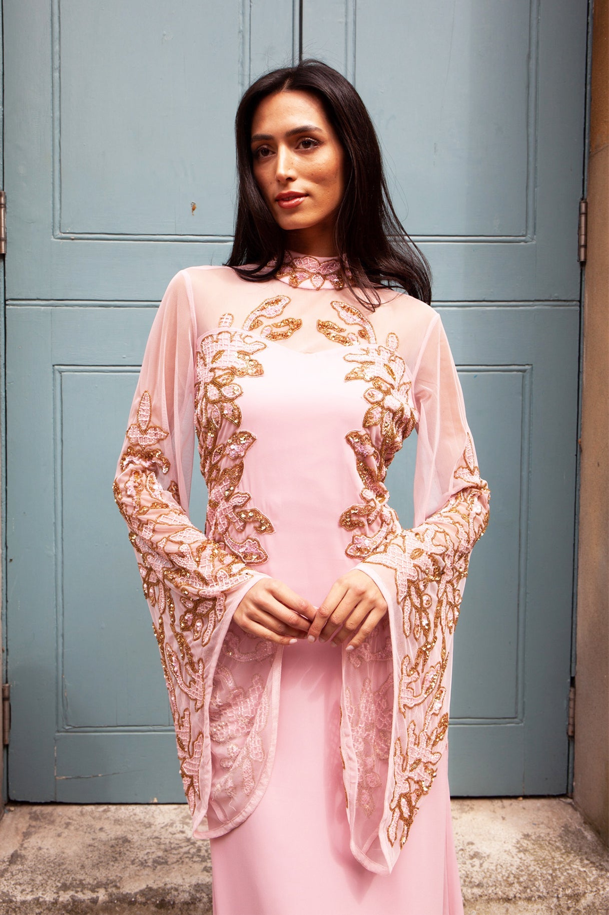 The Ruby Rose Gown is a poetic expression of elegance. Clothed in a delicate pink hue, this gown boasts a high neckline and long sleeves, both beautifully embellished with golden embroidery and sequins. Designed to flow with grace, it's perfect for those who desire a touch of royalty in their wardrobe. Whether attending a wedding or an upscale event, the Ruby Rose Gown is a stunning choice for making a sophisticated statement.