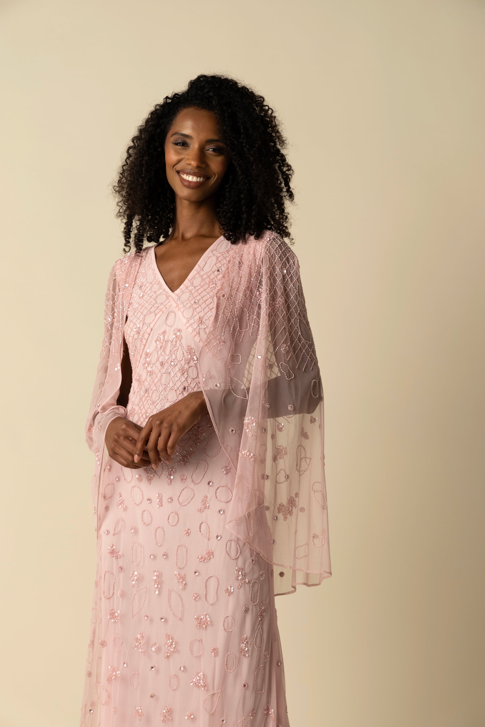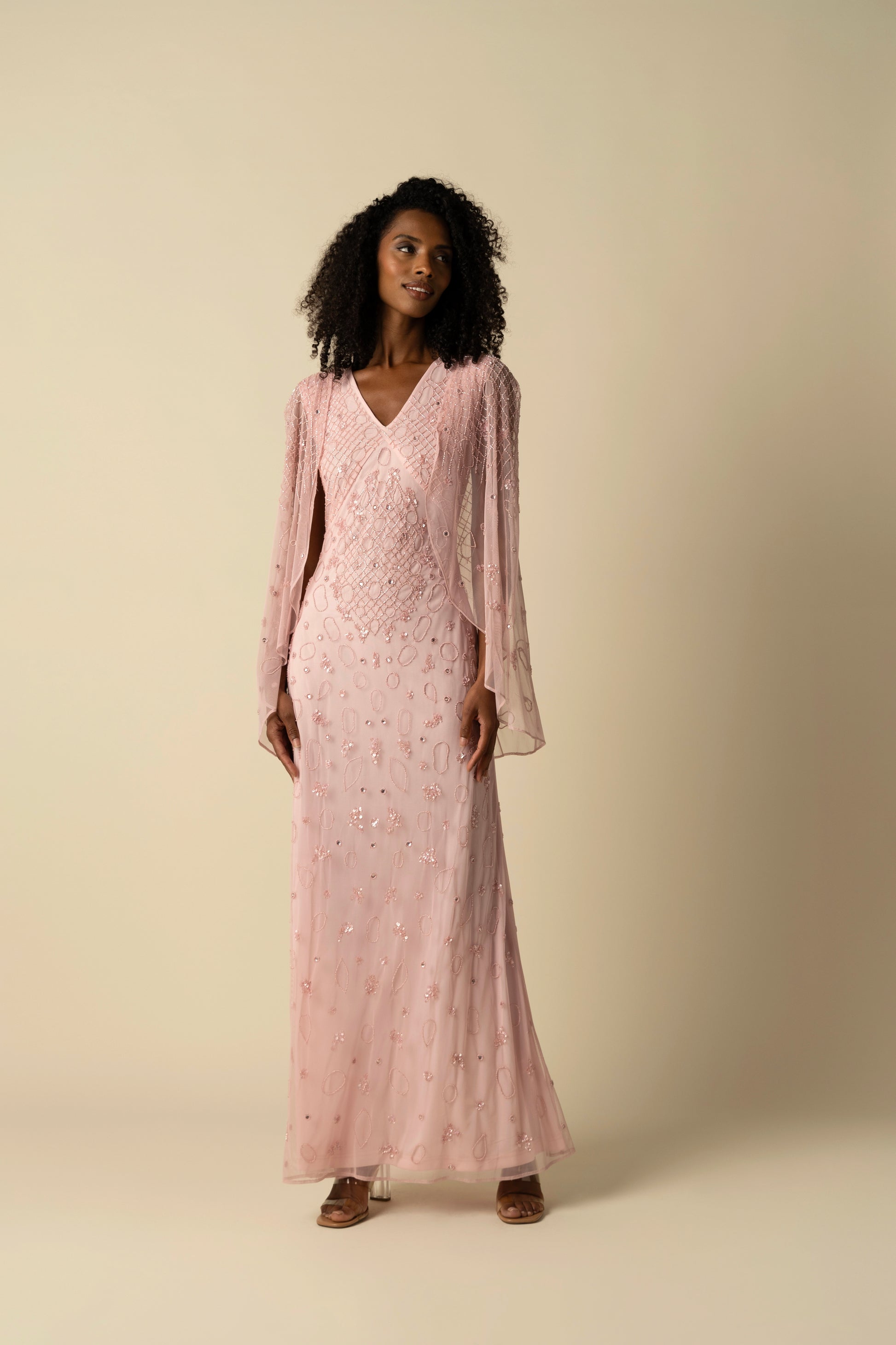 Step into a fairy tale with the Selena Gown, where delicate blush pink meets dazzling embellishments. This ethereal dress features a plunging V-neck and an attached cape, with a cascade of sequins and beads that catch the light with every movement. Tailored to flow and flatter, it's the perfect choice for bridesmaids, proms, or any enchanting evening. The Selena Gown is where dreamy design and luxurious detail come together to create a truly magical silhouette.