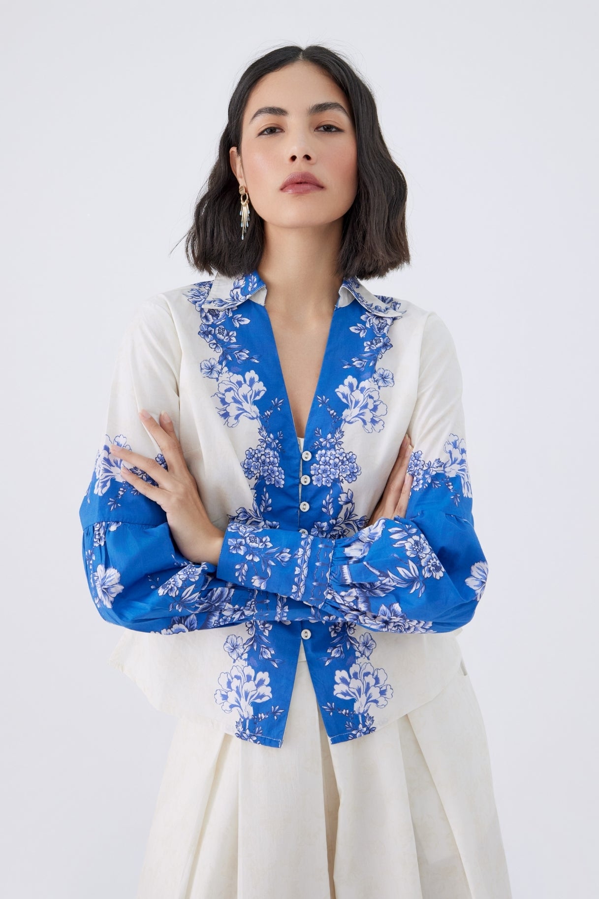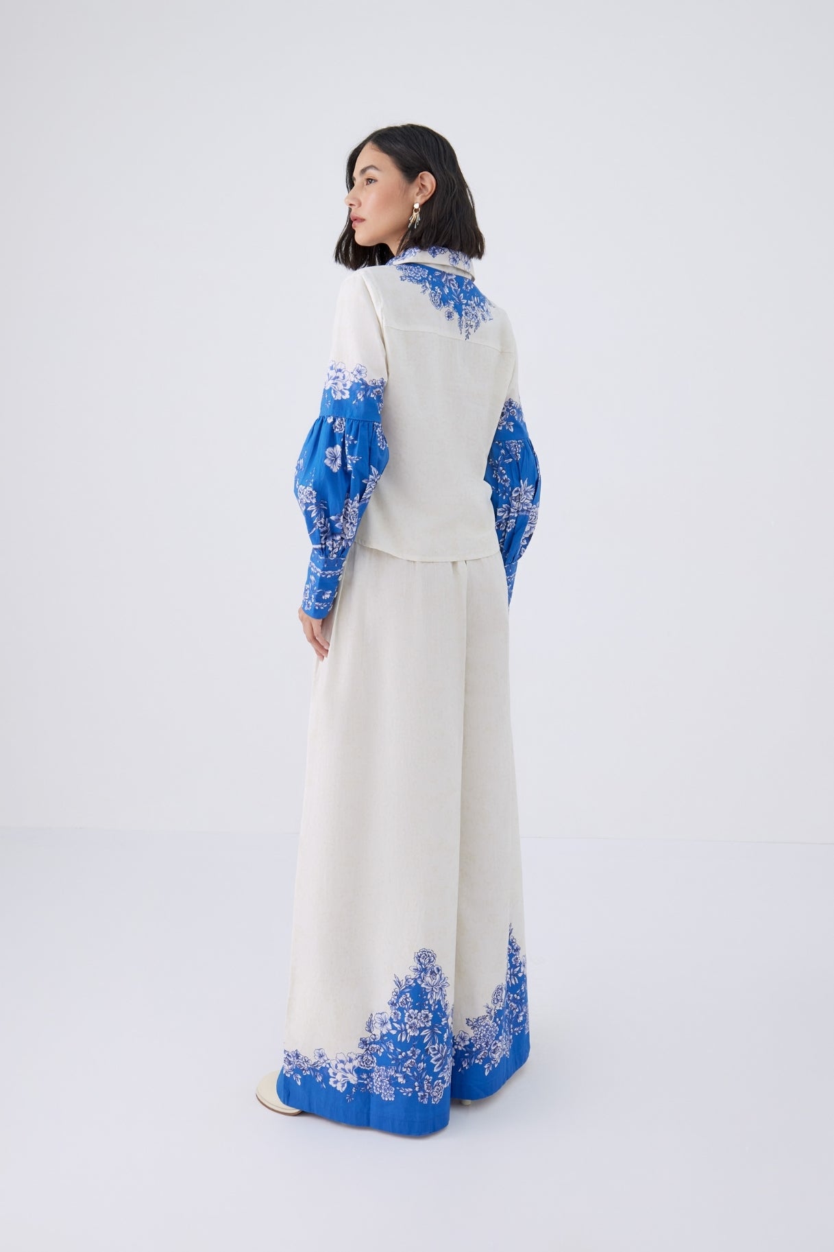 Wide-leg cotton trousers adorned with delicate blue print along the hem for a statement touch. Designed with a high waist and a flowing silhouette, they offer a flattering and breathable fit. Wear them with the matching shirt for a coordinated look or style them with a simple top for a refined aesthetic.