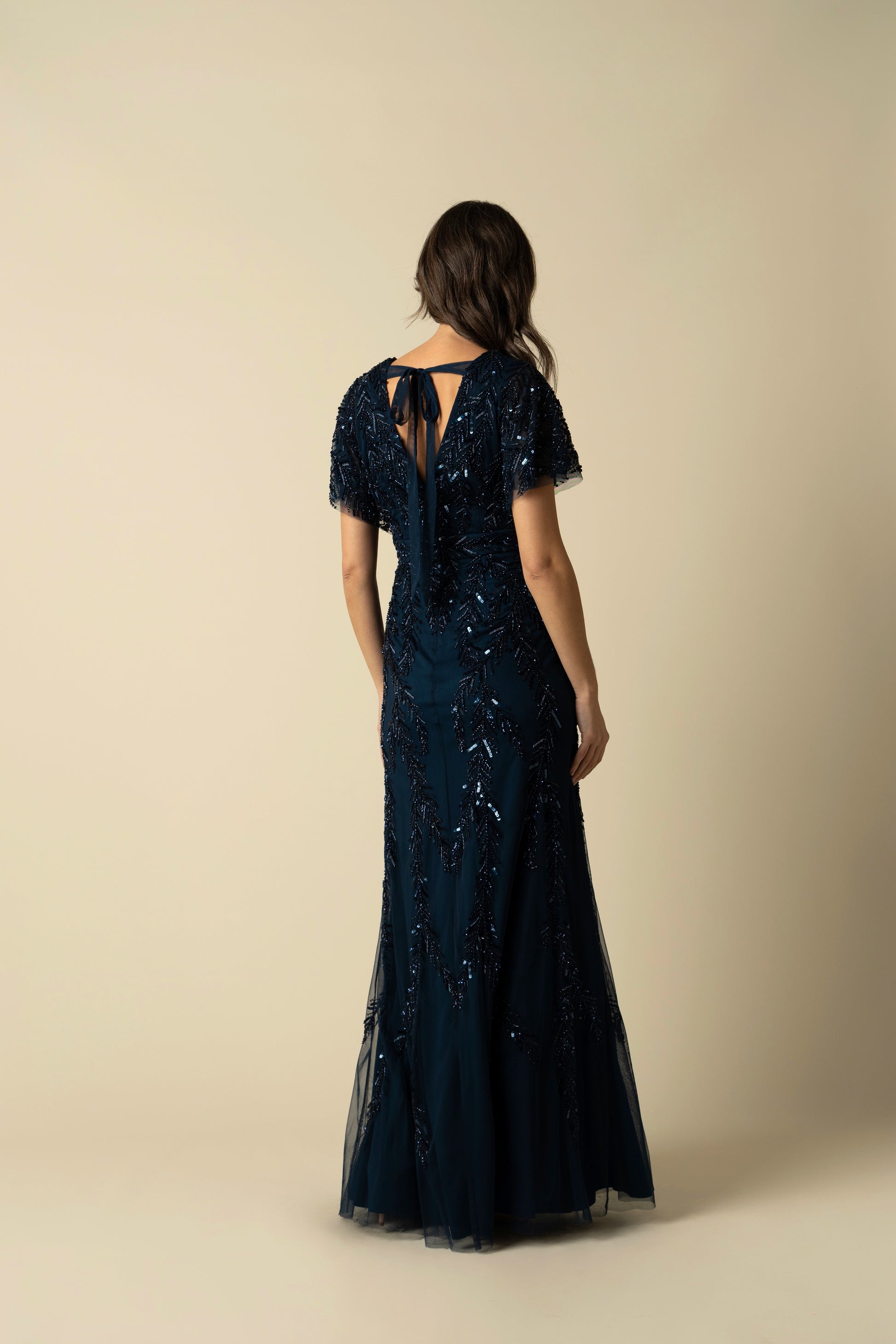 Captivate the room in the Serenity Gown, an exquisite creation that channels the depth of the midnight sky. This navy blue dress is a symphony of sophistication, with its sparkling sequin patterns and flattering V-neckline. Designed with fluttering short sleeves and a fluid silhouette, it's ideal for gala nights or elegant weddings. The Serenity Gown is a testament to timeless elegance, perfect for the woman who seeks to blend classic charm with a hint of modernity.