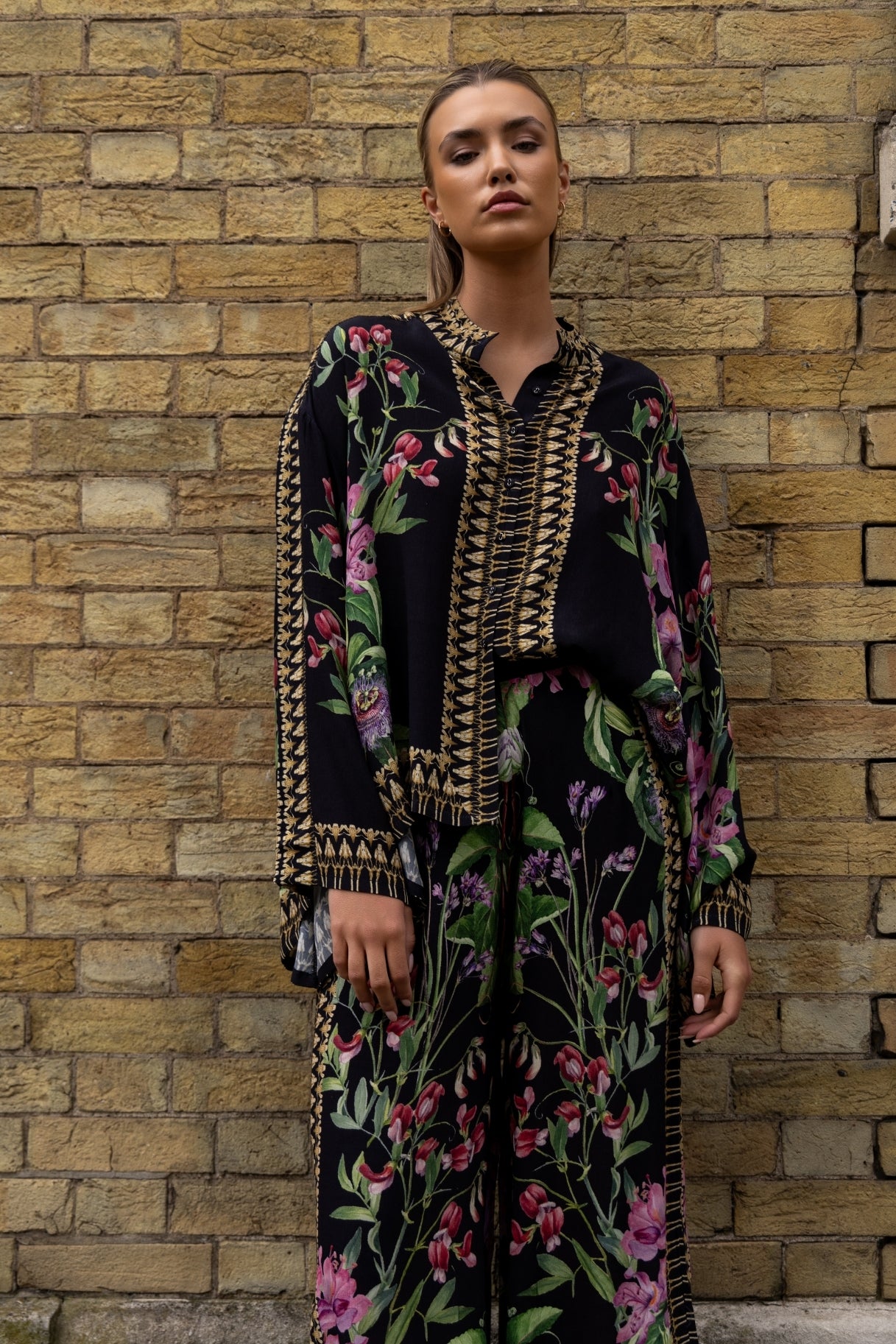 Flowy wide-leg trousers crafted from soft, lightweight fabric for all-day ease. Featuring a high-waisted fit and intricate floral prints with ornate border accents, they offer a bold yet elegant look. Wear them with the matching shirt for a coordinated ensemble or mix and match for a versatile wardrobe update.