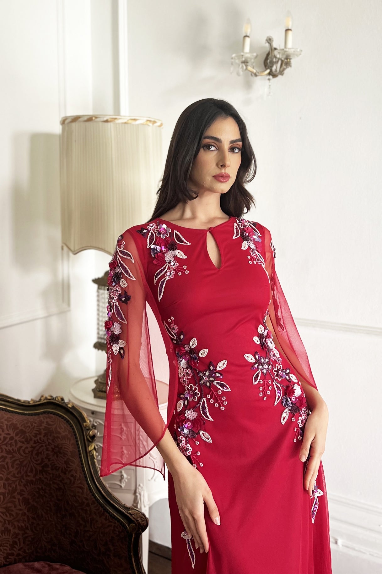 The Tessa Gown exudes a fiery elegance with its rich pink hue and distinctive floral embroidery. This gown features a tasteful keyhole neckline and dramatic flared sleeves, adding a modern twist to its classic floor-length design. Perfect for any formal occasion, the Tessa Gown combines bold color with sophisticated detailing to create an unforgettable look. Step into the Tessa Gown and embody the essence of poise and confidence at your next event.
