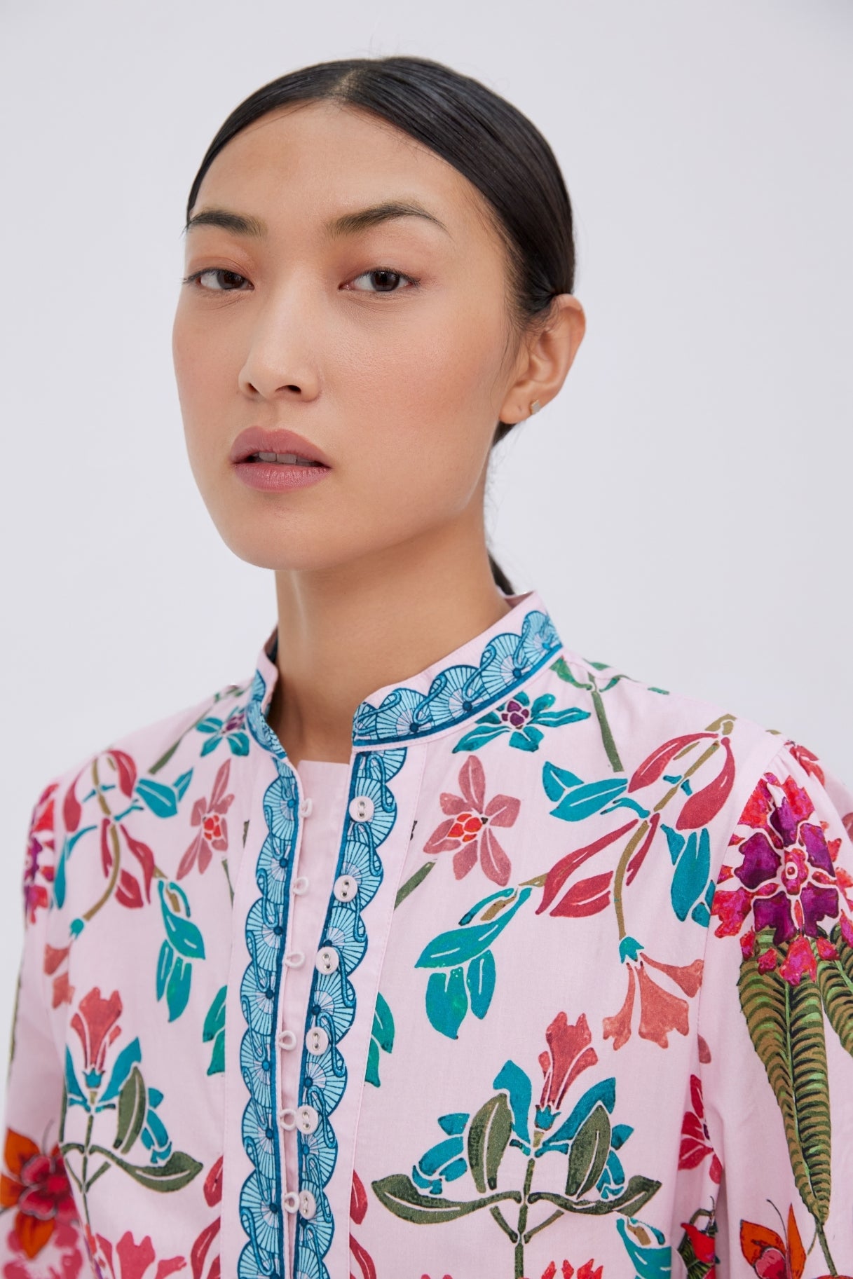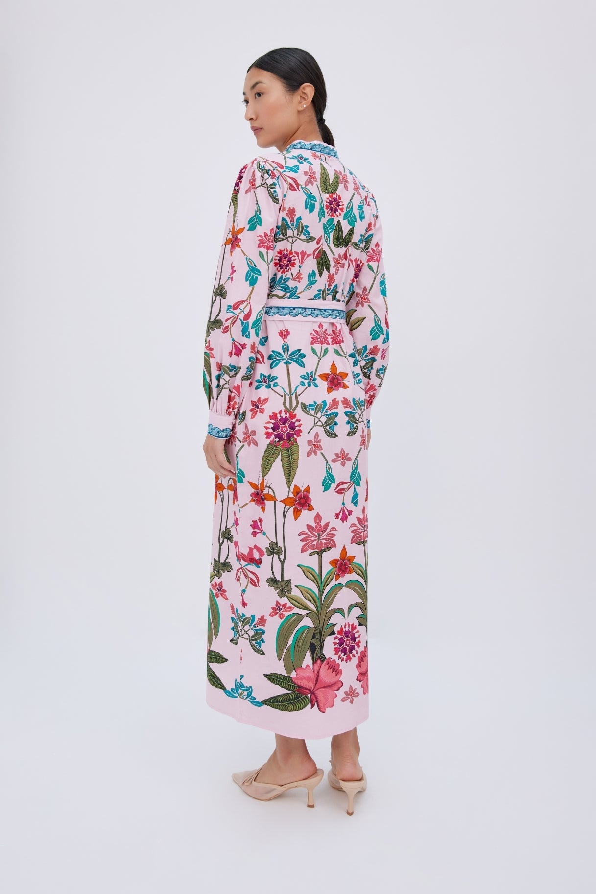 This elegant floral midi dress features a high collar, full-length sleeves, and a button-down front with blue embroidered trims. Adorned with vibrant botanical floral prints in colourfull shades, it exudes a fresh, feminine vibe. The dress is cinched at the waist with a matching tie belt for a flattering silhouette. Made from lightweight cotton fabric, it’s perfect for spring and summer events, garden parties, or resort wear.