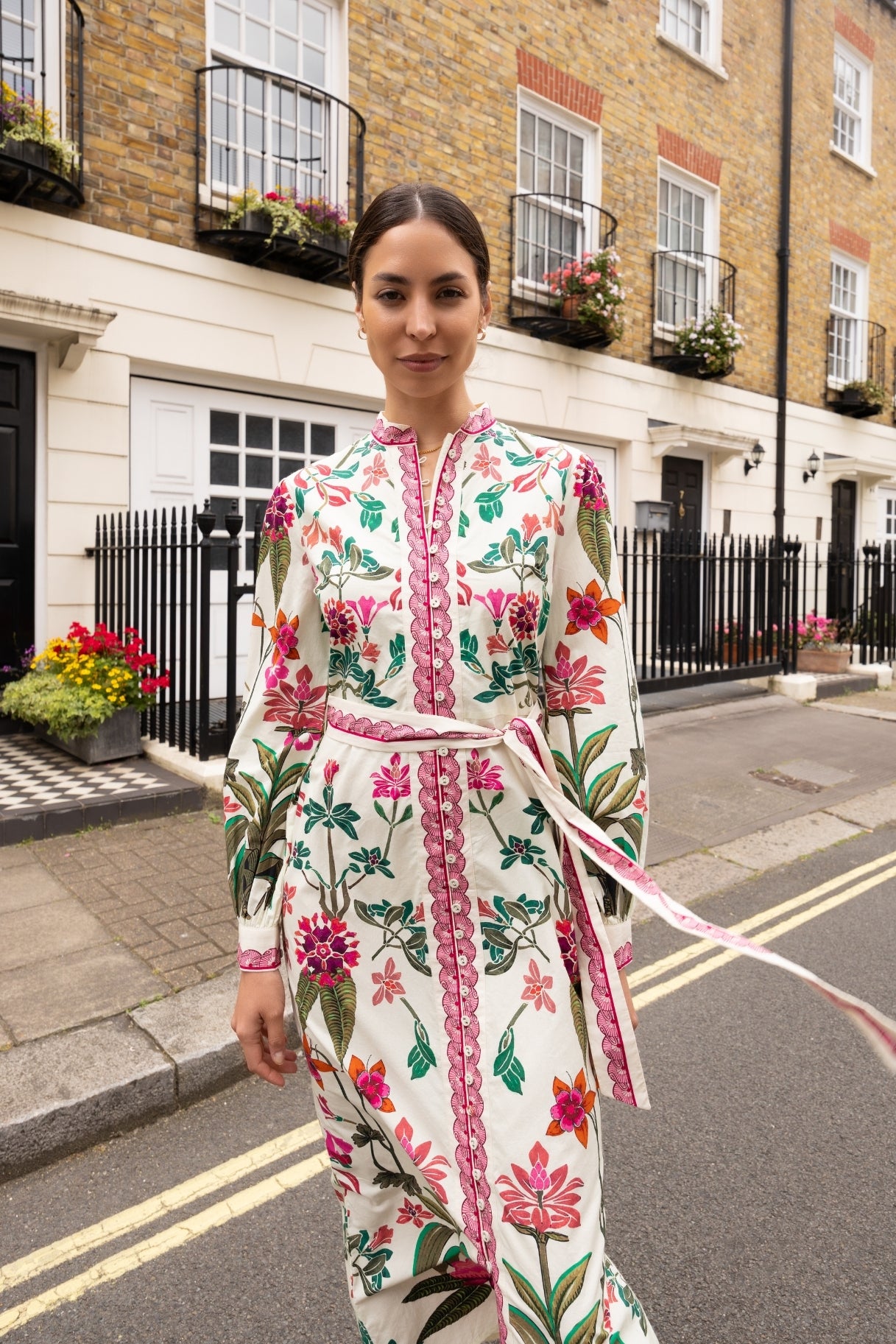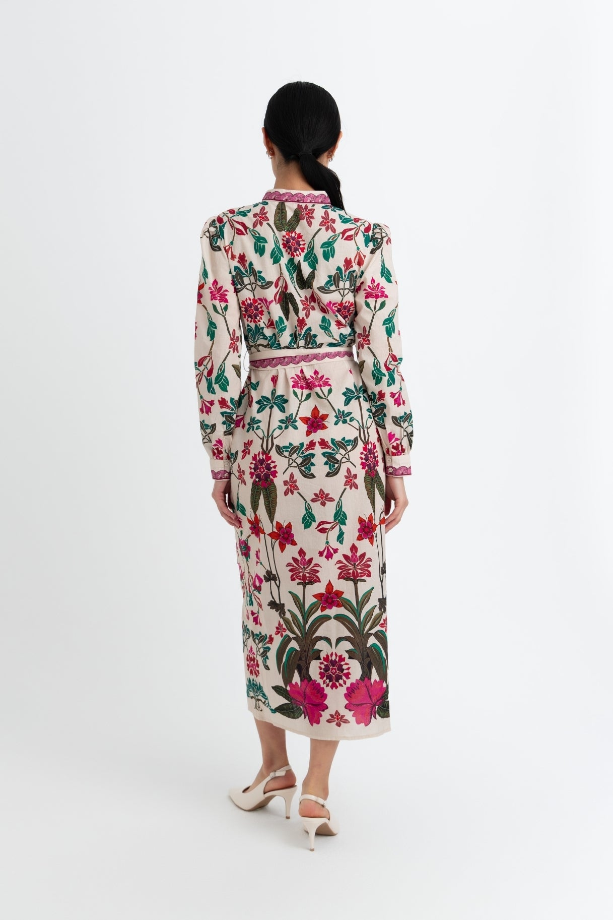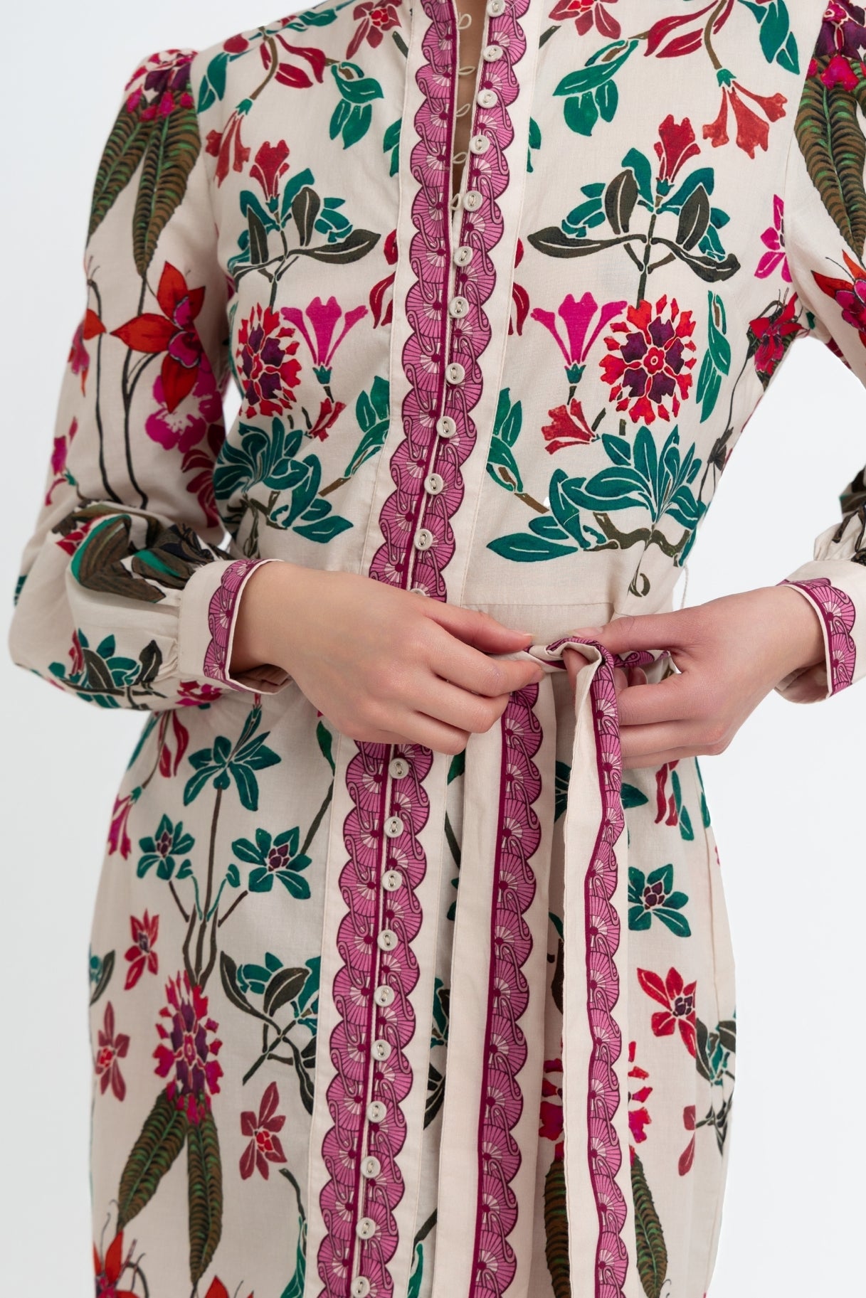 A breezy cotton midi dress featuring a high neckline, long sleeves, and fully functional buttons for a polished yet comfortable fit. Designed with a striking floral print and contrast border detailing, the lightweight fabric makes it perfect for effortless all-day wear. A timeless choice for both casual and dressy occasions.