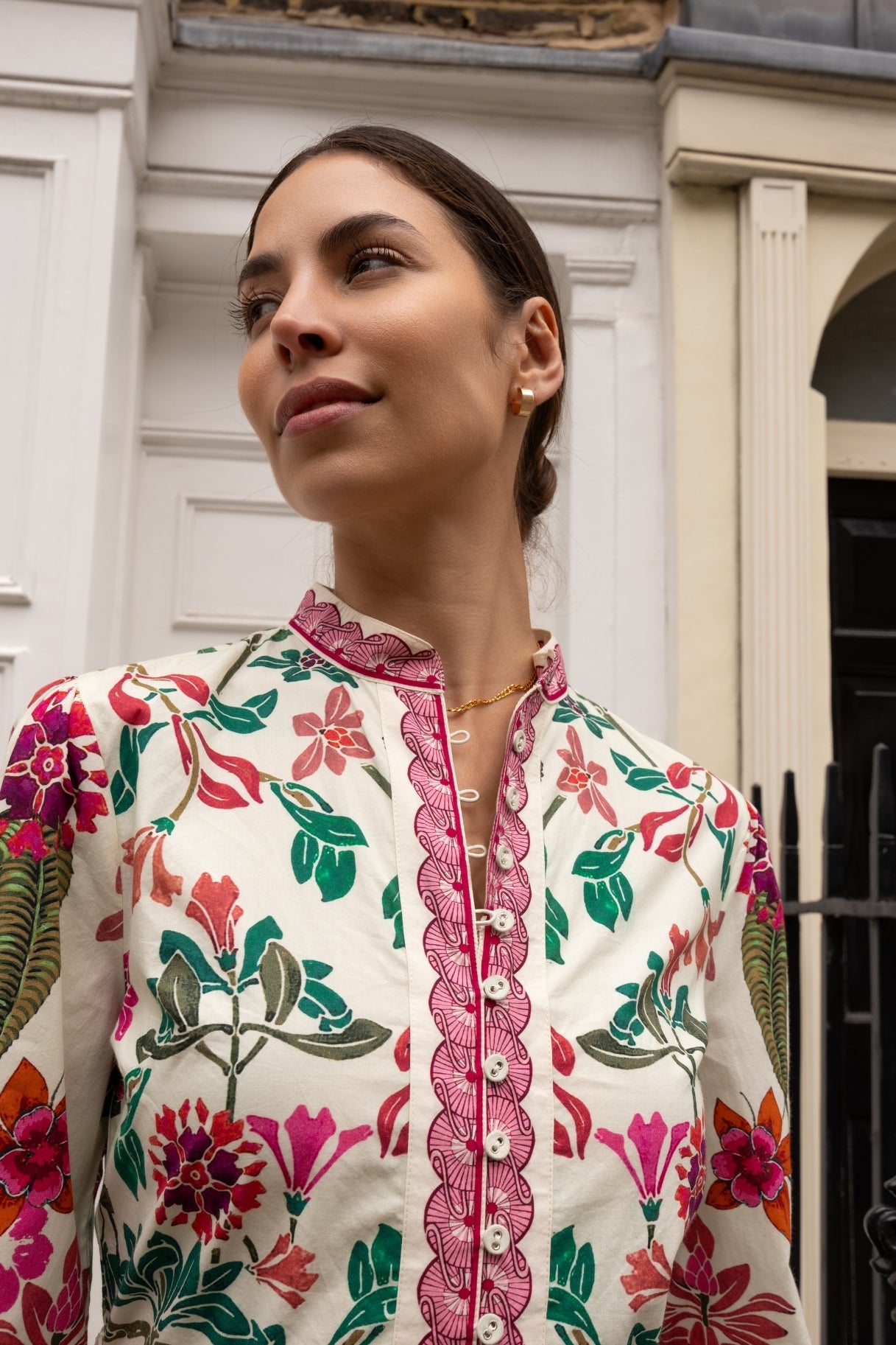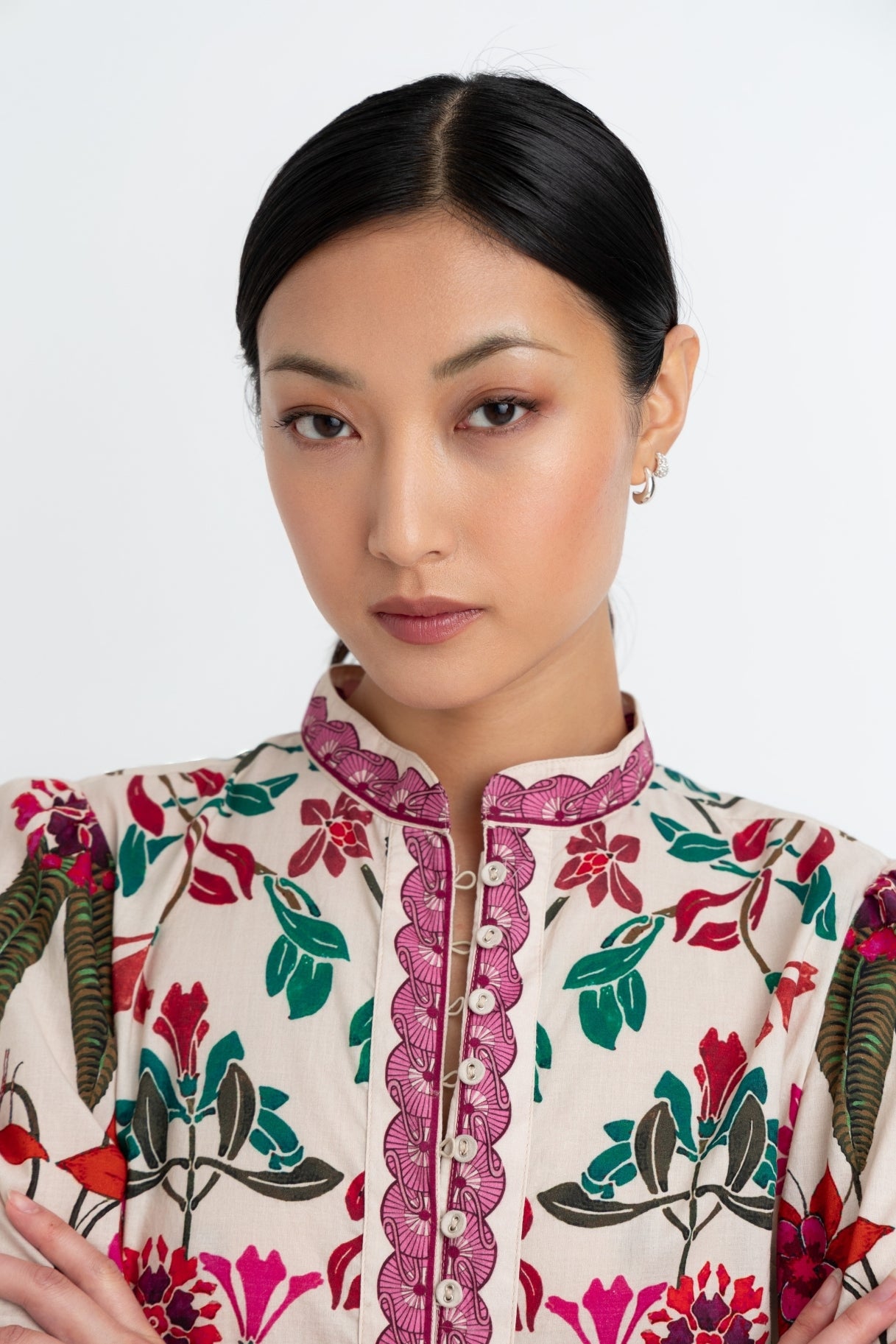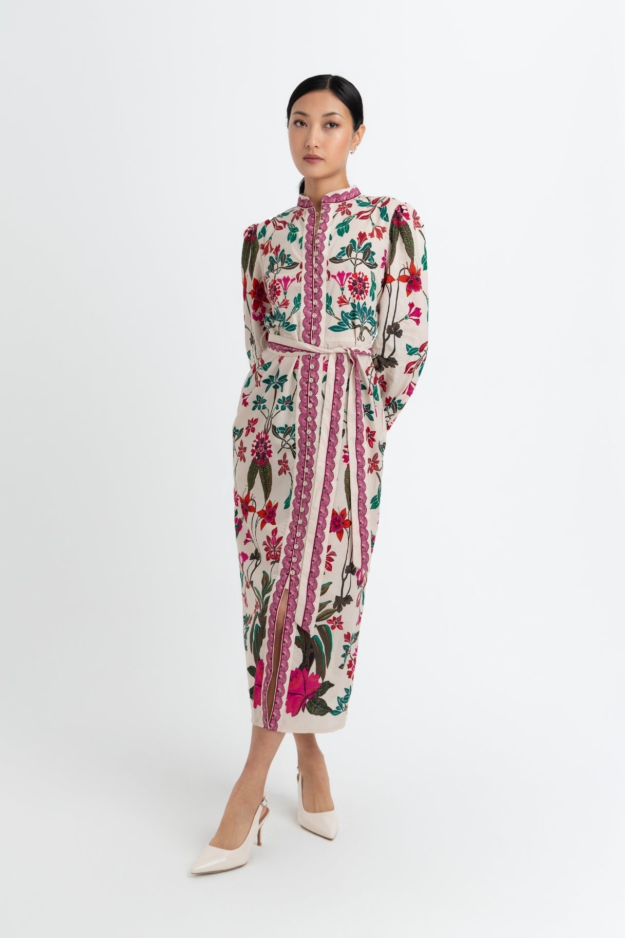 A breezy cotton midi dress featuring a high neckline, long sleeves, and fully functional buttons for a polished yet comfortable fit. Designed with a striking floral print and contrast border detailing, the lightweight fabric makes it perfect for effortless all-day wear. A timeless choice for both casual and dressy occasions.
